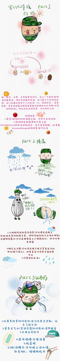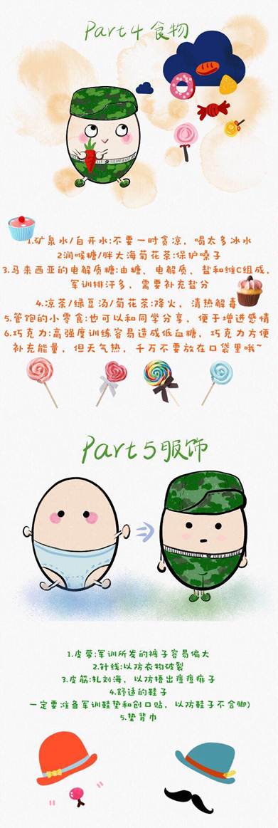 很多女同学身体情况欠佳,自己本身血压就低于平均水平,不注意饮食,生怕自己发胖,认为早上不吃早餐是既可以省钱,又可以减肥的好方法,这种想法非常有害。校医务室在此强烈呼吁大家早上一定要吃早饭,原来同学们一直在为高考努力学习,一般不会参加课外活动,但是军训期间每天都要训练,体力消耗很大,如果不注意饮食和营养,就能很好的完成军训任务,达不到军训的目的。一般军训中因为血糖低引起的症状有:虚汗、脑晕、心跳加快、眼冒金花、颤抖、饥饿感、无力、手足发麻。如果出现这种症状,一定要向军训军官汇报,请求暂时休息,低血糖引起的问题不容易发现,有些人以为就是有点中暑,不以为意,如果你一大早就出现中暑的情况,并且是每天都如此,这样就要注意一下了。不要等到一头栽倒在地,人事不醒才进行急救和处理。如果自己每天都出现这种情况,请立即到校医务室去检查血压,并按医生的建议去做。