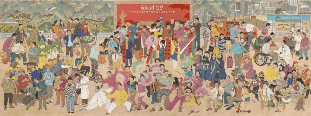 三年的时间,1095 个日日夜夜,师生团队戮力同心,不负韶华,在中国美协、重庆美协和四川美院党委的领导与关怀支持下,如期完成了创作工程。作品以精谨细腻、色彩艳丽的中国工笔画形式,绘就了一幅中国共产党把人民对美好生活的向往作为奋斗目标,带领中国人民奔向幸福新时代的壮阔画卷。