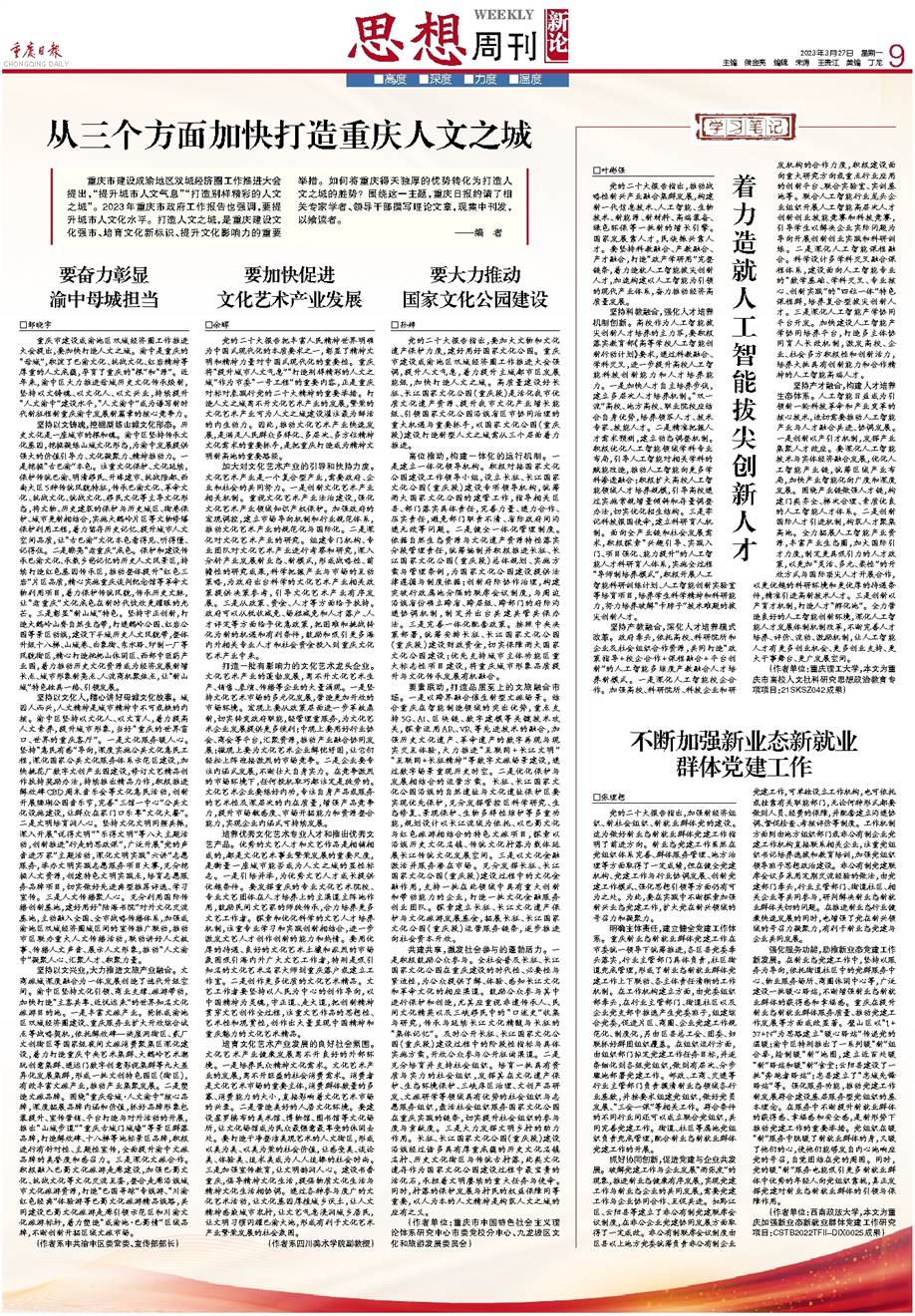 重庆市建设成渝地区双城经济圈工作推进大会提出,“提升城市人文气息”“打造别样精彩的人文之城”。2023年重庆市政府工作报告也强调,要提升城市人文化水平。打造人文之城,是重庆建设文化强市、培育文化新标识、提升文化影响力的重要举措。如何将重庆得天独厚的优势转化为打造人文之城的胜势?围绕这一主题,重庆日报约请了相关专家学者、领导干部撰写理论文章,现集中刊发,以飨读者。