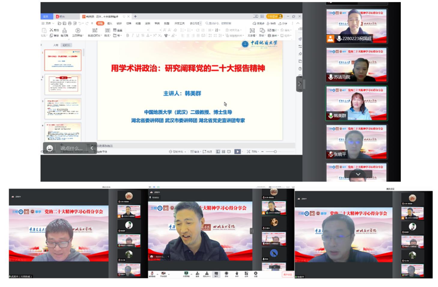 三所学校的10位专家学者分享了学习党的二十大报告的心得体会,并由各学校马克思主义学院院长进行了点评和总结。本次联学会呈现了四个特点:一是时机好,带着“热气”学;二是水平高,领学和分享有质量;三是形式新,三校联学、师生共学;四是收获大,助推思政课教师把党的创新理论讲深讲透,更好地落实立德树人根本任务。
