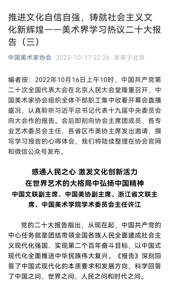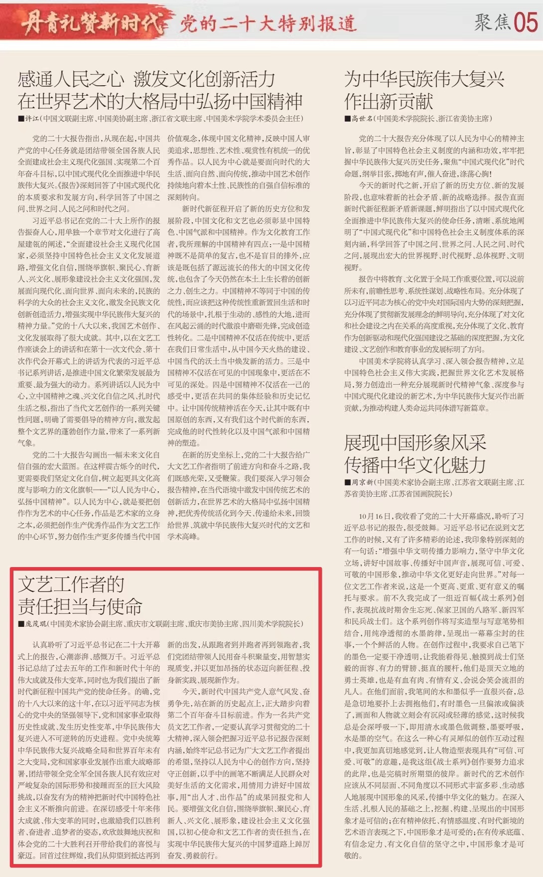 10月22日,《美术报》第5版的“丹青礼赞新时代——党的二十大特别报道”专栏,也刊登了庞茂琨校长的该篇心得文章。