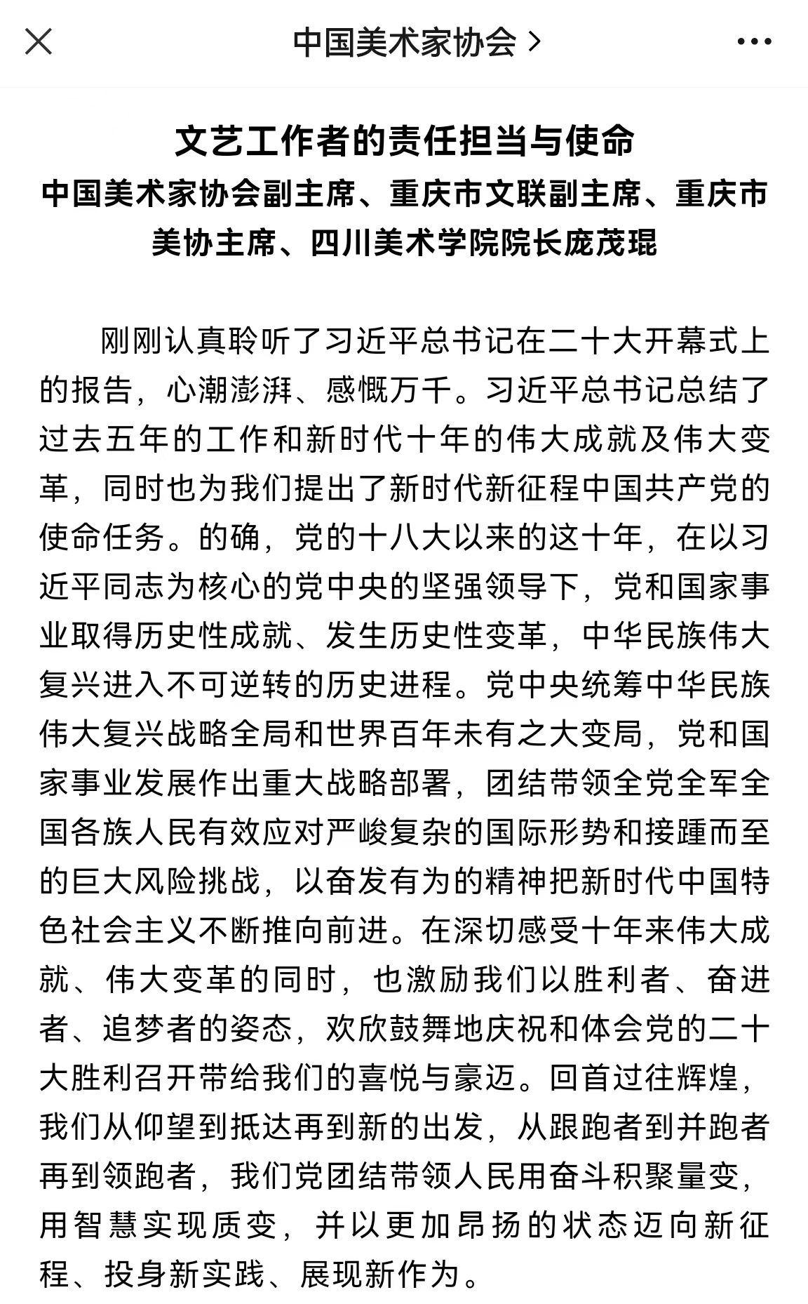 10月17日,中国美术家协会公众号发送的推文《推进文化自信自强,铸就社会主义文化新辉煌——美术界学习热议二十大报告》中,包括了中国美术家协会副主席、重庆市文联副主席、重庆市美协主席、四川美术学院院长庞茂琨学习党的二十大报告的心得文章《文艺工作者的责任担当与使命》。