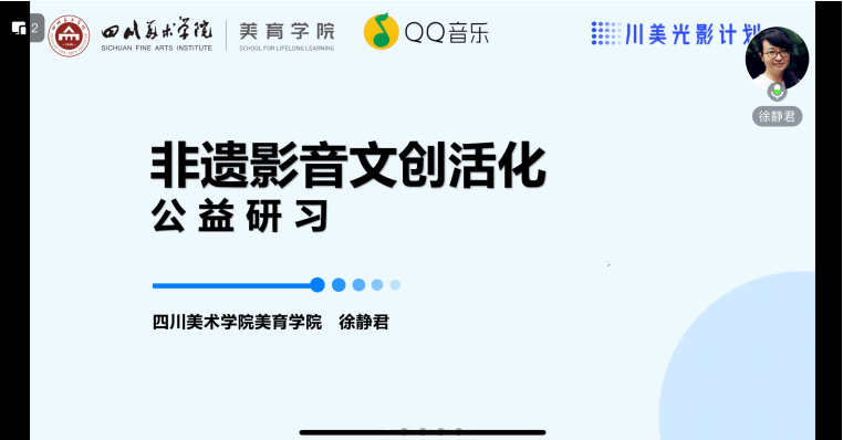 近日,四川美术学院美育学院与腾讯音乐娱乐科技(深圳)有限公司合作,联合开办《川美光影计划——非遗影音文创活化公益研习》网络培训活动,带领参培学员深入了解四川地区丰富的非遗影音文化并进行相关创作。