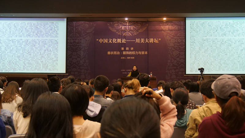 2018年10月31日晚7:00,由四川美术学院公共课教学部主办,教务处协办的“中国文化概论---川美文化大讲坛”第四讲,在川美虎溪校区多功能厅开讲。北京服装学院教授、博士生导师陈芳做客大讲坛,为川美广大师生带来一场题为《垂衣而治:服饰的权力与资本》的精彩讲座。川美虎溪校区700余名师生聆听了讲座,黄桷坪校区近400名师生观看了讲座的实况直播。本次讲座由川美公共课部教务主任郭昕老师主持,田源、吴亚娜老师统筹。公共课教学部主任杨茂森等参加了讲座。