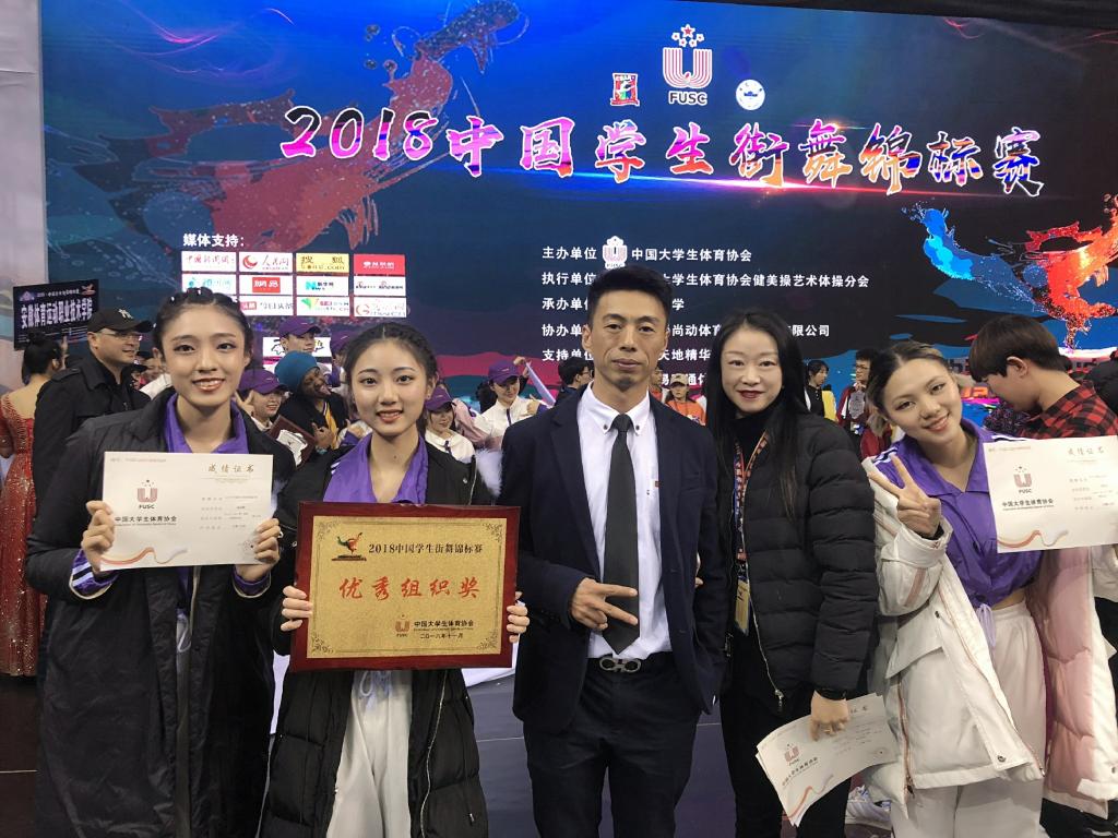 本次大赛是首届全国学校街舞锦标赛的独立赛事,由中国大学生体育协会主办,共有来自19个省市、48所院校的600余名运动员参与本次大赛。为提供高水平的点评指导,本次大赛还特邀国内外的八位顶级职业舞者组成了权威评委阵容。我校队员们克服训练的各种伤痛,在赛前仍刻苦地备战,在队员们的顽强拼博下,爵士规定套路项目和北京大学、安徽大学、华北电力大学、新疆大学、浙江大学等一起进入八强,获得第五名的好成绩,虽然自选项目失利未能进入前八名,但我们的征战任然是被肯定的,竞赛主委会授予我校“优秀组织奖”的荣誉。