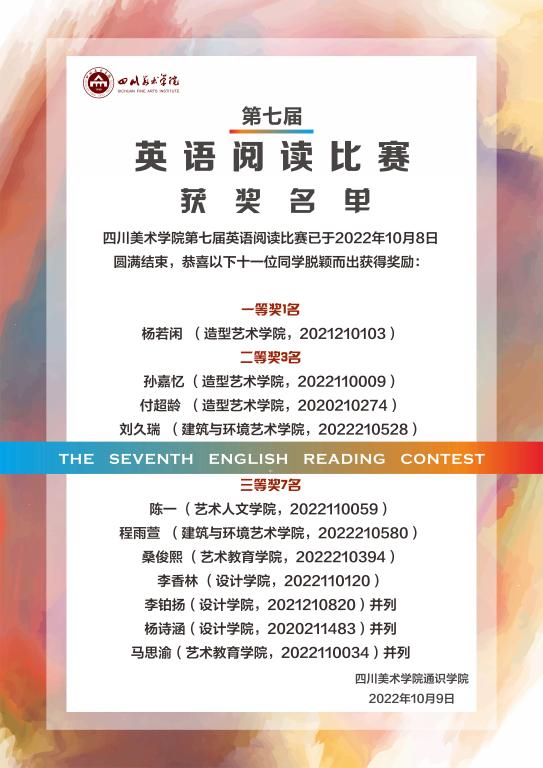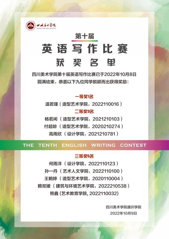 为促进我校学生的国际交流能力,展现我校学生风采,由四川美术学院通识学院主办的第七届英语阅读比赛、第十届英语写作比赛于2022年10月8日圆满落幕。