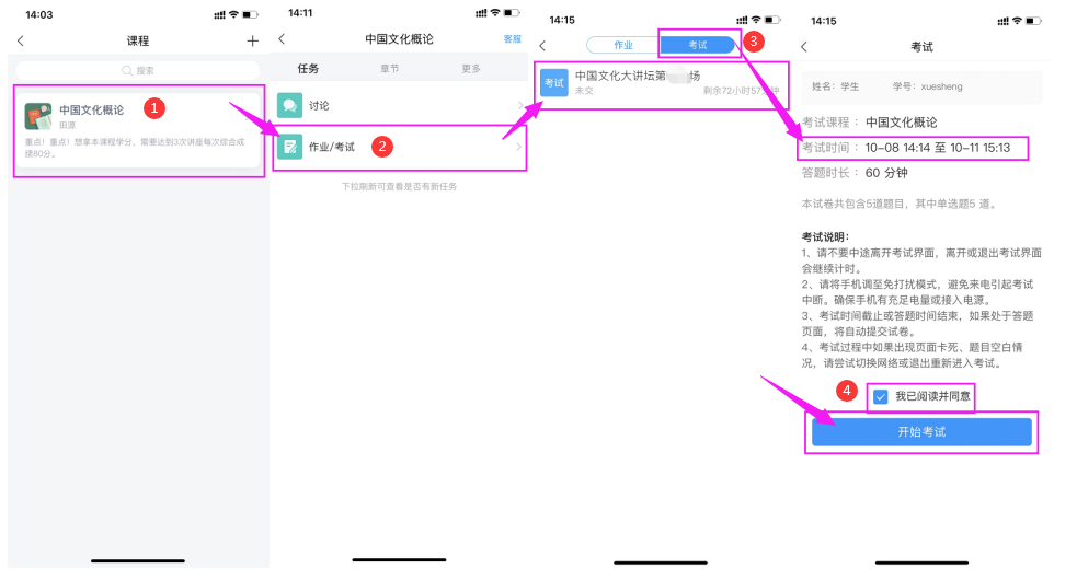 点击课程进入,点击【考试】找到本次考试,点击进入参加考试,作答完成提交考试即可获得成绩