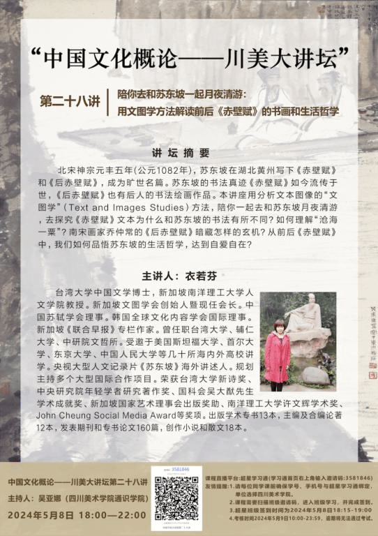 北宋神宗元丰五年(公元1082年),苏东坡在湖北黄州写下《赤壁赋》和《后赤壁赋》,成为旷世名篇。苏东坡的书法真迹《赤壁赋》如今流传于世,《后赤壁赋》也有后人的书法绘画作品。本讲座用分析文本图像的“文图学”(Text and Images Studies)方法,陪你一起去和苏东坡月夜清游,去探究《赤壁赋》文本为什么和苏东坡的书法有所不同?如何理解“沧海一粟”?南宋画家乔仲常的《后赤壁赋》暗藏怎样的玄机?从前后《赤壁赋》中,我们如何品悟苏东坡的生活哲学,达到自爱自在?