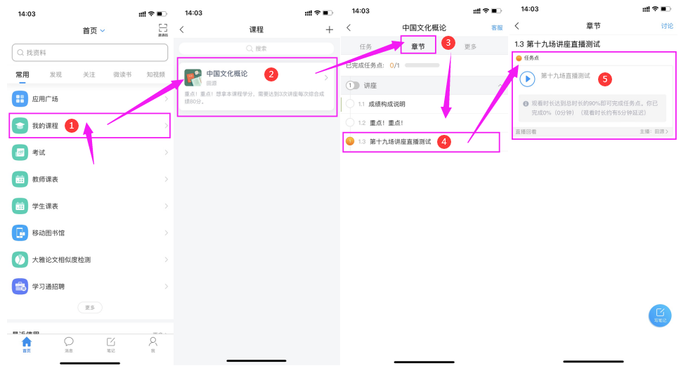 进入首页点击【我的课程】,找到本次直播讲座课程《中国文化概论》,点击【章节】找到本次直播点击进入观看直播即可,达到完成直播要求即可完,有资格参加考试。