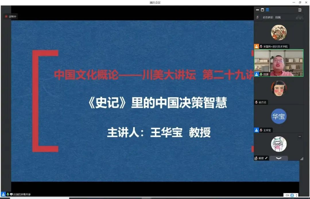 此次讲座兼具史学理论与现实意义,王华宝教授切中决策智慧的核心问题,对《史记》里的文体样式、经典故事、人物谱系、伦理道德、政治军事等多维度的综合阐释,聚焦中国哲学社会科学话语的重要范畴,增强了我们对中国决策的史学涵养。大学生从古人智慧里赓续文化基因,运用到专业学习、日常生活以及未来工作的各个场域。全面丰富的研究内容与饱含哲思的文化阐释,契合了四川美术学院通识教育的理念宗旨,以文化精髓刺激艺术灵感,构建完整人格。