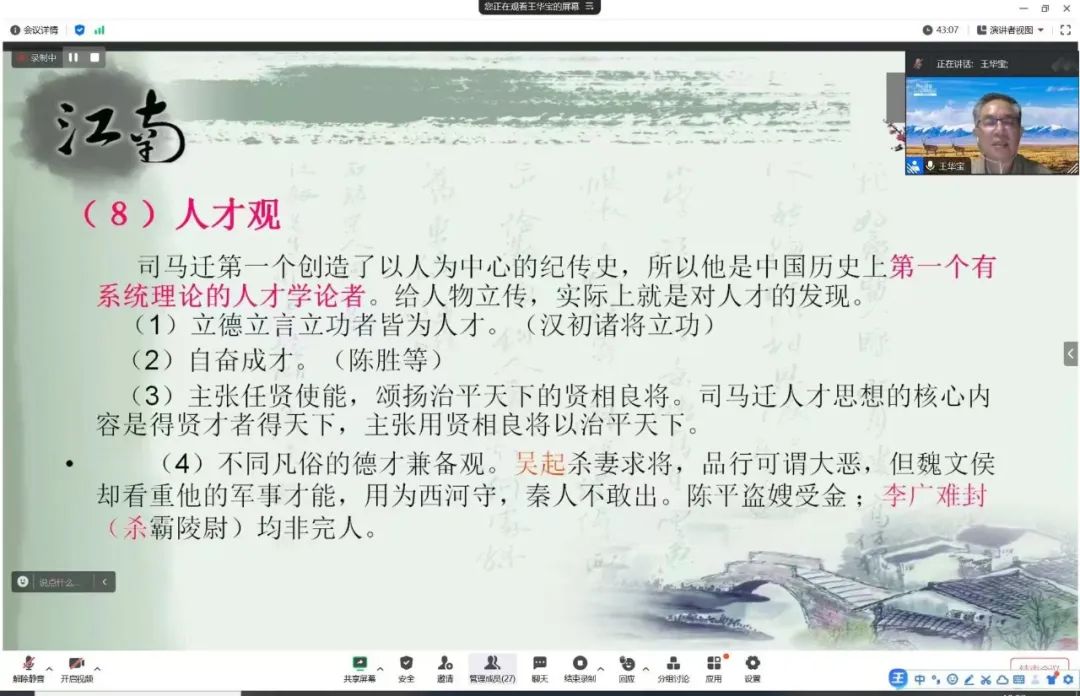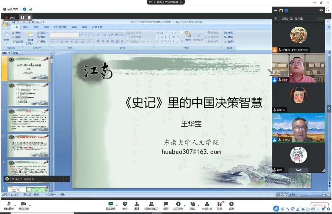 本期课程讲座题目为《<史记>里的中国决策智慧》,主讲人王华宝,东南大学人文学院教授、博导,历史系主任,院教学委员会主任,古文献学研究所所长。兼任中国训诂学研究会副会长、中国史记研究会理事、江苏文脉工程编委、江苏省语言学会会长、江苏省古籍保护专家委员会委员等。长期致力于中华优秀传统文化的传承传播和创新发展,主持多项国家级和省部级课题,发表学术论文数十篇,出版专著《<史记>金陵书局本与点校本校勘研究》等6部,参与整理《史记》(中华书局修订本,10册)等,合作主编《史记》融媒体读本(3册)、《俞樾全集》(32册)等,担任《中国训诂学报》执行主编。获得多项国家与省部级奖。