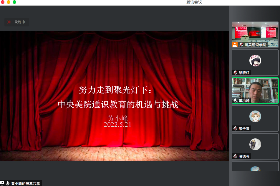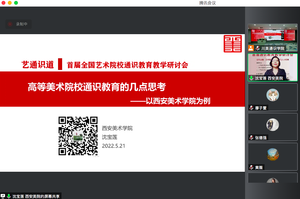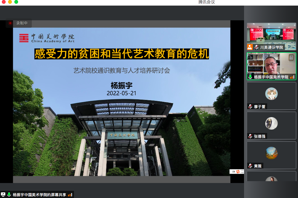 下午两点,会议第三阶段继续进行,四川美术学院通识学院教师姜影主持,五位发言专家分别是:吉林艺术学院公共基础部主任张旭、湖北美术学院公共课部主任周捷峰、南京艺术学院文学教学部主任张德强、鲁迅美术学院大连校区人文学院院长曹天慧以及四川美术学院通识学院英语教研室主任肖红。张旭主任的发言题目是《新文科视野下专业艺术人才培养中通识教育的创新维度》,紧跟新时代高等教育步伐,对标艺术院校通识教育新举措;周捷峰主任发言题目是《学习贯彻习近平总书记教育重要论述,加强美术院校通识课程“供给侧”改革——关于湖北美术学院公共课部通识课程改革的探索与思考》,融入课程思政的通识教育,必将筑牢艺术育人的立德边界;张德强主任的发言题目是《通识教育 线上线下——以大学文学课程为例》,延伸课堂空间的教学意识,有机整合人文学科的混合教学模式;曹天慧院长的发言题目是《基于素质与兴趣培养的艺术设计史论通识课教育》,挖掘理论类通识课程的专业素养与学生兴趣,二者无缝衔接;肖红主任发言题目是《构建分层级多元化的课程体系,培养语言+艺术的国际化人才》,为艺术院校通识教育的英语课程建设贡献川美方案。