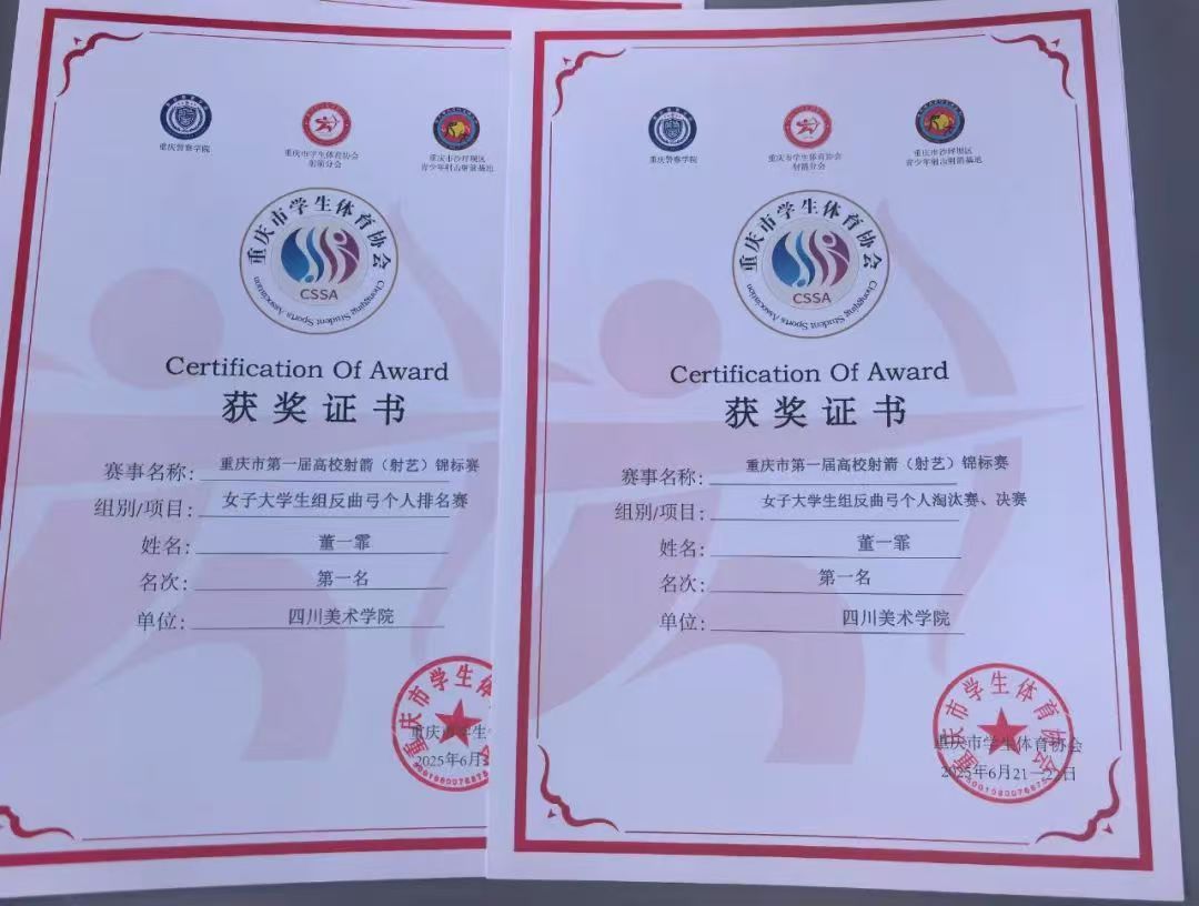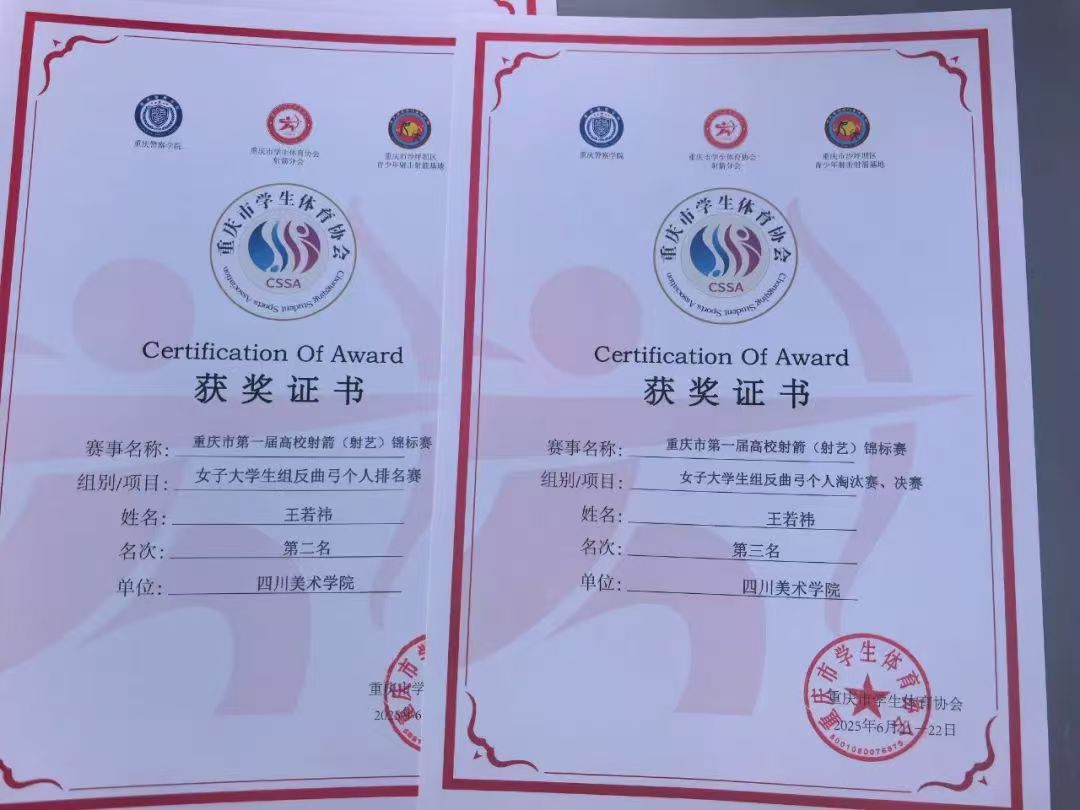 6月21日,重庆市第一届高校射箭(射艺)锦标赛在重庆警察学院火热开赛,来自全市12所高校及射箭协会的百余名运动员齐聚赛场,展开精彩角逐。我校射箭队由通识学院体育教学部教师带队,2名运动员参加女子大学生组反曲弓排名赛和淘汰赛。尽管比赛当日暴雨绵延,但2位女运动员毫不退缩,以顽强意志与沉稳心态从容应战,充分彰显出川美学子锐意进取的精神风貌。凭借稳定发挥,一举荣获了2个第一名、1个第二名、1个第三名的优异成绩。