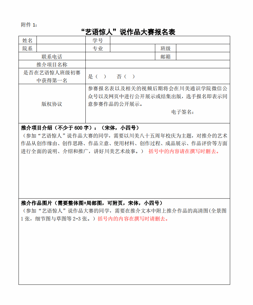 5.版权公开:参赛报名表以及相关的视频后期将会公开在川美通识学院微信公众号以及网页中进行展示,选手报名即表示同意参赛作品的公开展示与结集出版。