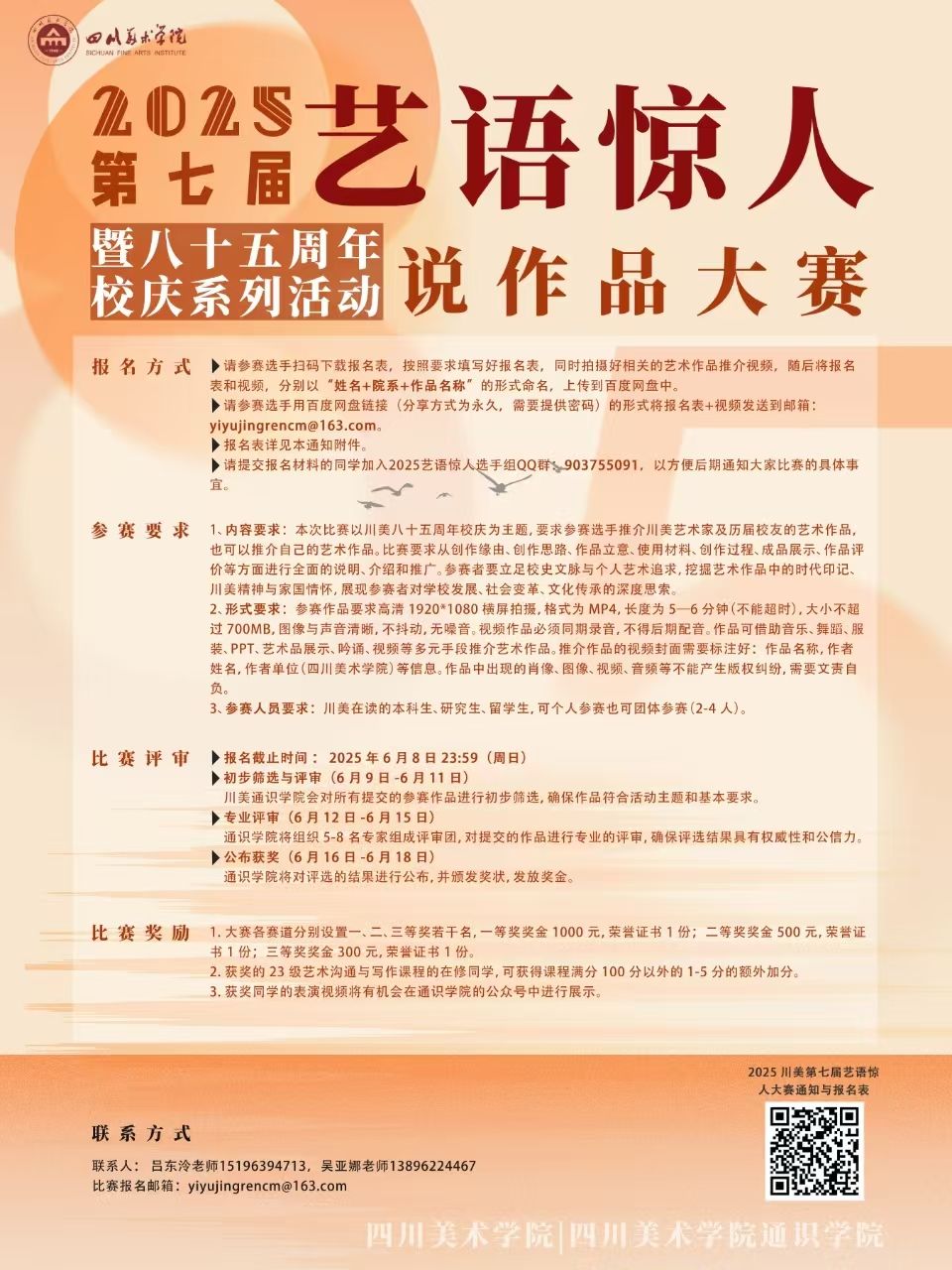 岁月峥嵘,初心如磐。培根铸魂,艺脉长青!2025年是四川美术学院建校的85周年。为弘扬川美精神,传承艺术文脉,贯彻落实党的二十大精神,展现广大师生对学校的热爱与祝福,指导学生体悟中华优秀文化内涵,丰富文化思想实践,提升语言文化素养,激发文化自信自强,培养能说会写的艺术英才,四川美术学院拟举办第七届“艺语惊人”说作品大赛。本次赛事由四川美术学院通识学院主办,是四川美术学院的校级赛事,是川美通识教育探索通专共生、课赛结合、多维评价的改革探索赛事,是重庆市一流本科课程艺术沟通与写作课程的延伸实训平台。基于此,本活动的具体方案如下。