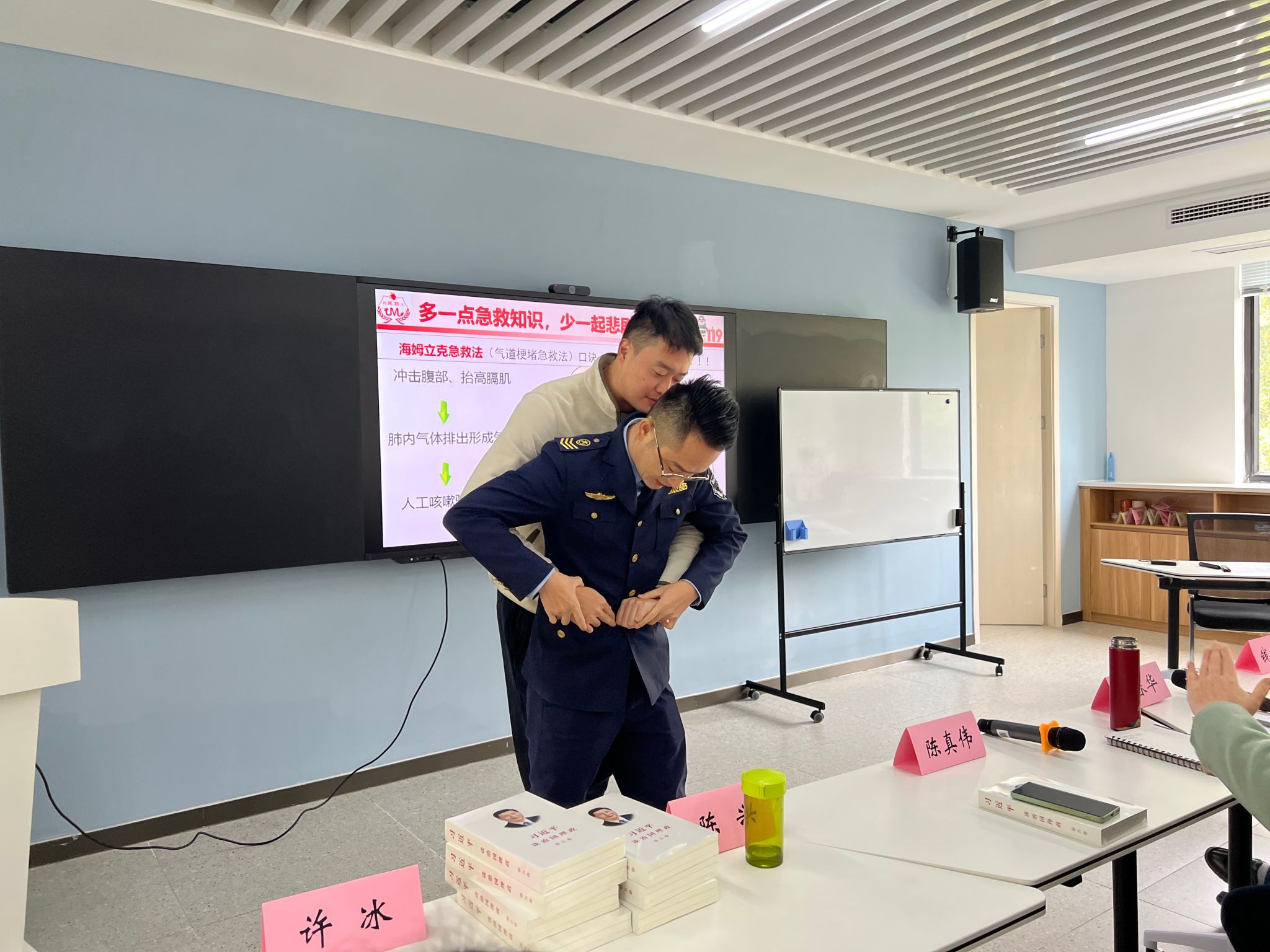 培训中,胡教官首先针对海姆立克急救法进行拆解教学,从气道异物梗阻的识别、腹部冲击的动作要领(姿势、力度把控)到模拟实操演练,用理论结合实操的讲解方法让教职工快速掌握这个“救命技能”。