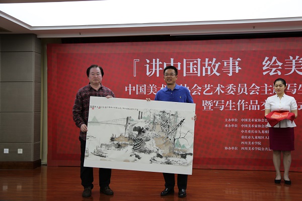在写生作品交接仪式上,中国美协组织的写生专家展示了13幅写生作品,九龙坡区副区长李洪亮接受了赠送,并为赠送作品的中国美协专家颁发了作品收藏证书。