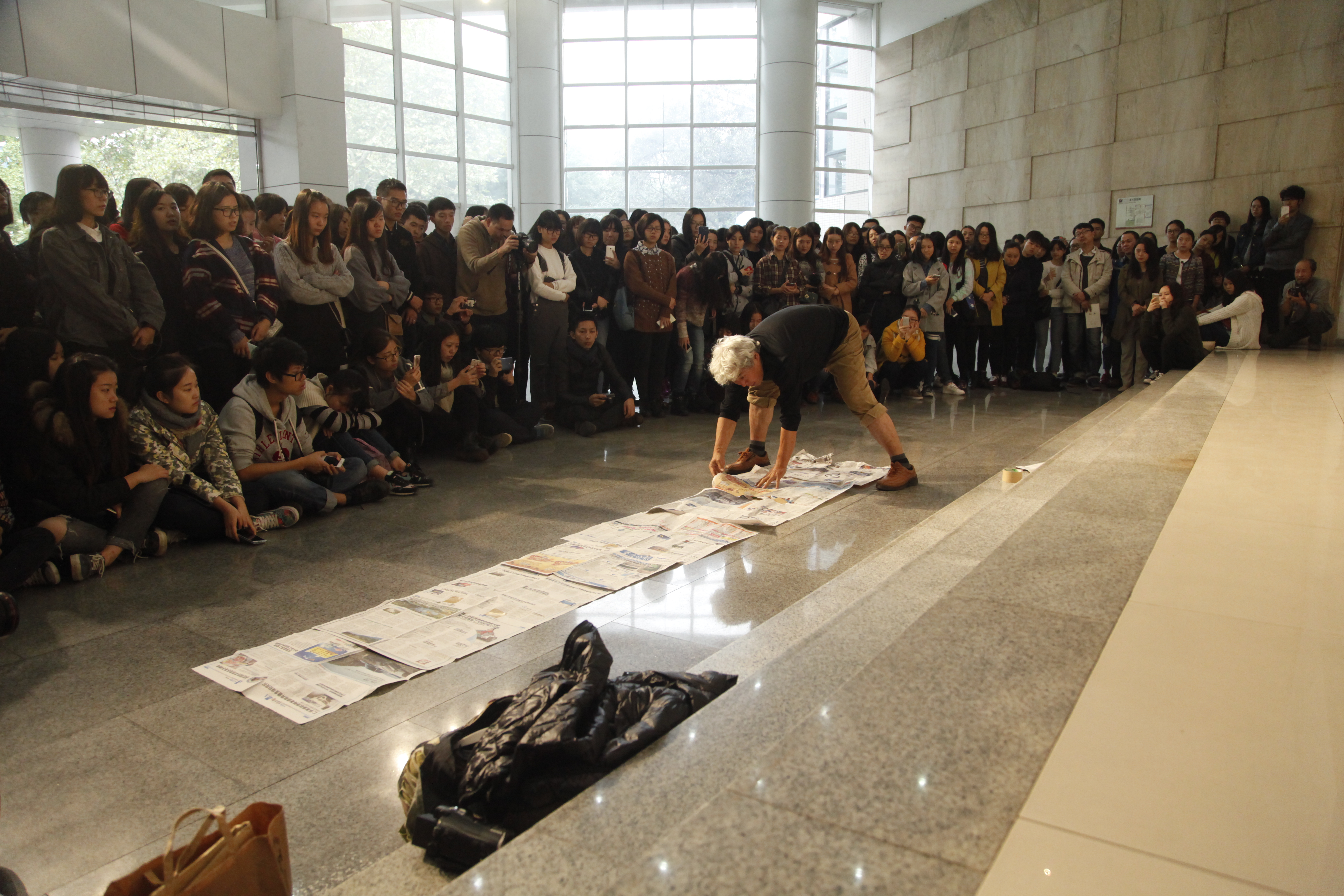 首先,左益发表致辞,肯定了公共艺术教育国际工坊的创立和开展是我校教学改革创新的一次重大尝试,并寄语同学们争做具有全球视野、开放姿态、动态思维的新时代艺术人才。随后钟正武代表公共艺术学院感谢受邀艺术家的辛勤工作,介绍本次展出的学生作品特点,最后左益宣布展览开幕。同时霜田诚二先生带领学生们进行了精彩的个人行为艺术表演。