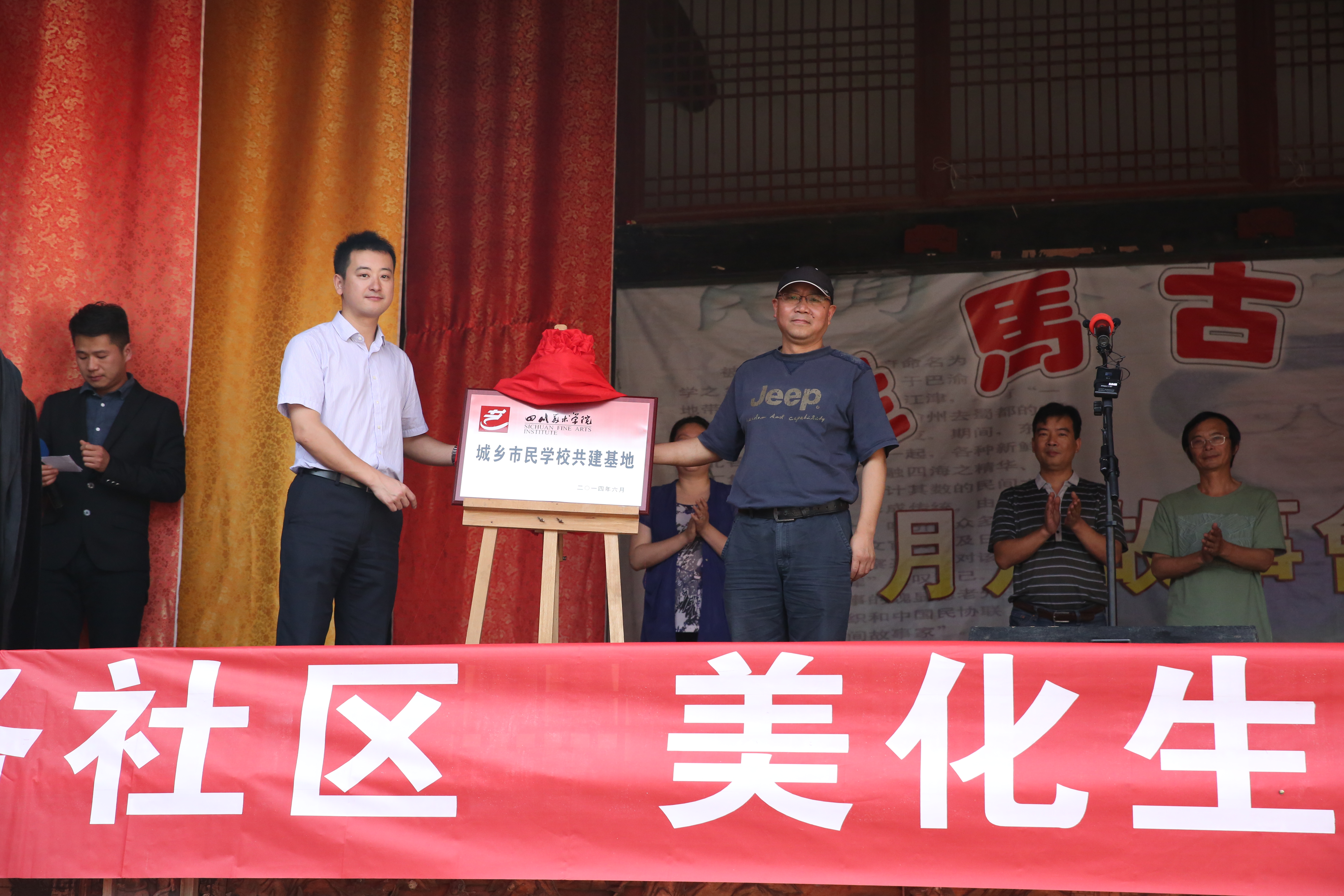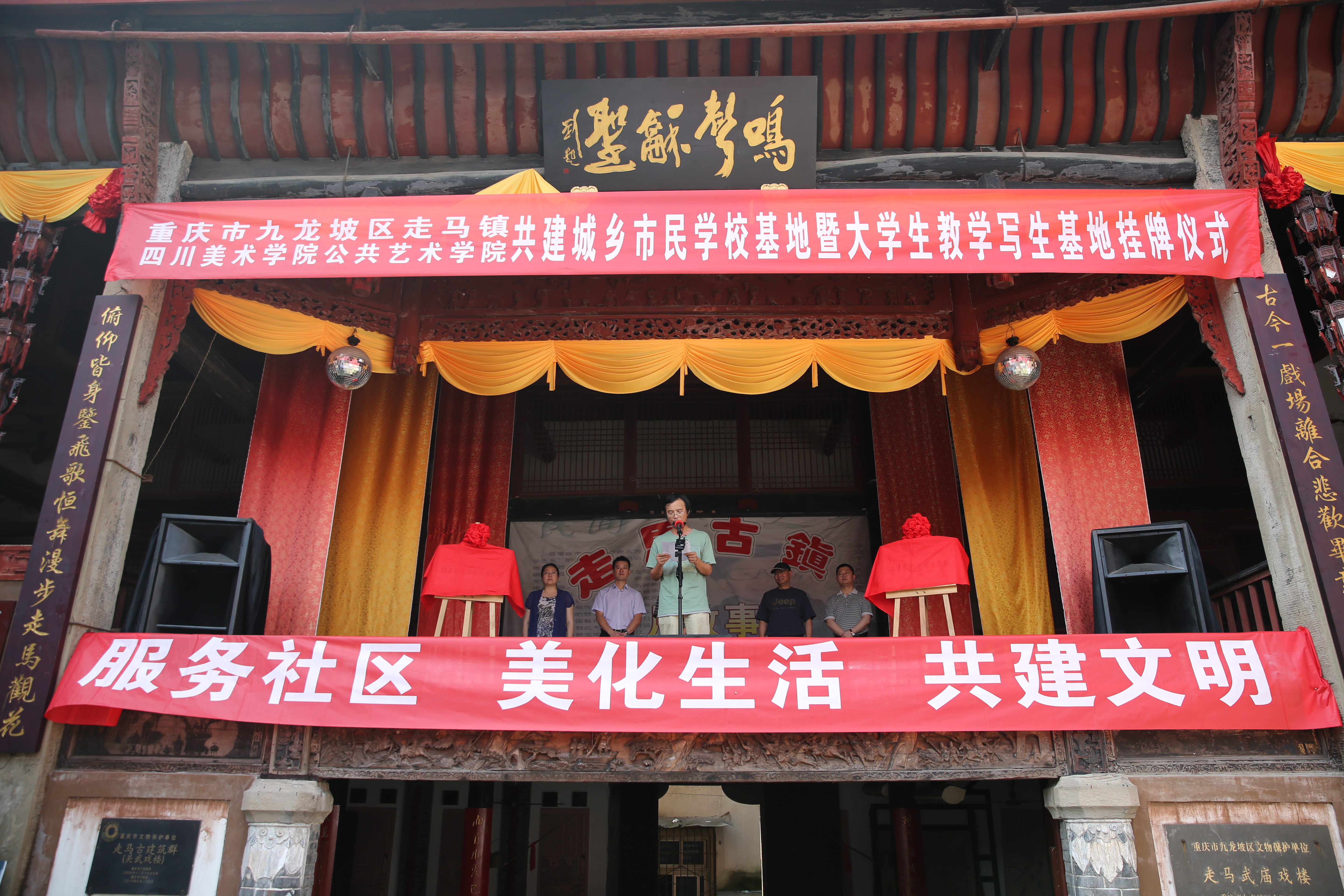 6月18日上午10:00 ,重庆市九龙坡区走马镇、四川美术学院公共艺术学院共建城乡市民学校基地暨大学生教学写生基地挂牌仪式在走马古镇戏楼隆重举行。走马镇党委书记黄伟、共青团九龙坡区委副书记余立、我院党总支副书记谢鸣理、秦谊,以及走马镇各村(居)团支部书记、社区五职干部和到场的百余名师生、村民一起参加了仪式。