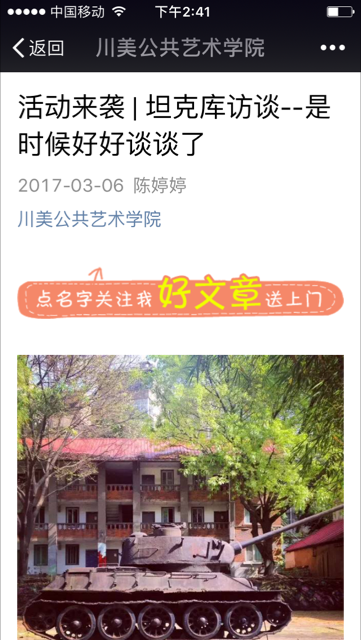 目前,“坦克库访谈”活动已开展8次,覆盖了照明艺术、公共艺术、壁画艺术、游戏设计、展示设计、城市空间设计等专业方向,在“川美公共艺术学院”微信平台进行了全文全程推送。活动的开展,为公共艺术学院师生搭建了一个交流沟通的平台,也使周波、曾令香、刘凯、陈星宇等一批专业教师成为学生的成长导师,受到师生的广泛好评。
