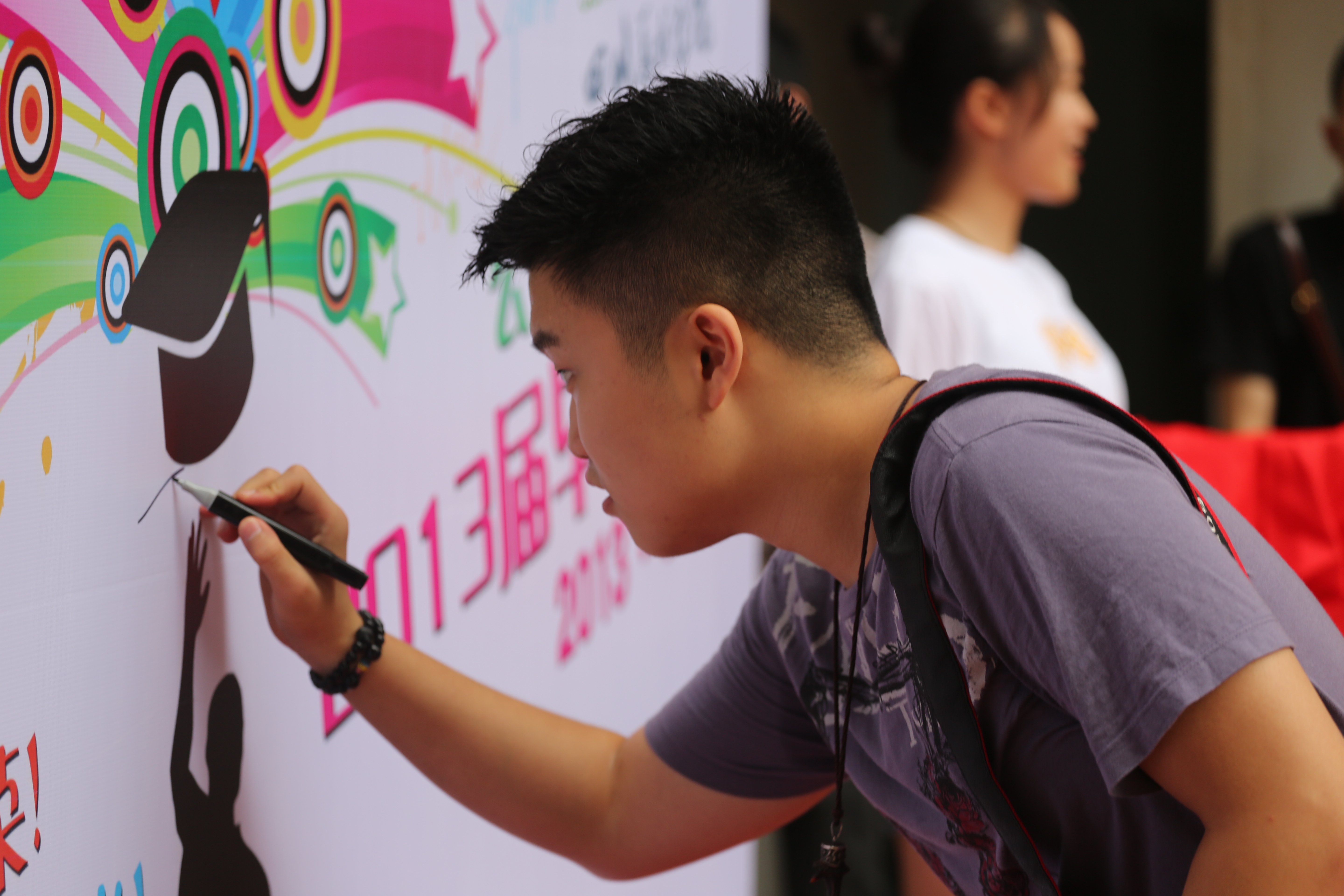 3:00在综合楼广场进行了入场式,师生们一起走过红地毯,在“今天我以川美为荣,明天川美以我为荣”的背景喷绘上写下自己的名字,作为留给母校的纪念。紧接着伴随着艺术团带来的校园歌曲联唱和特别制作的“致青春”短片,毕业生们一起追忆着自己的青春岁月、校园往事,典礼在一丝温情中拉开序幕。