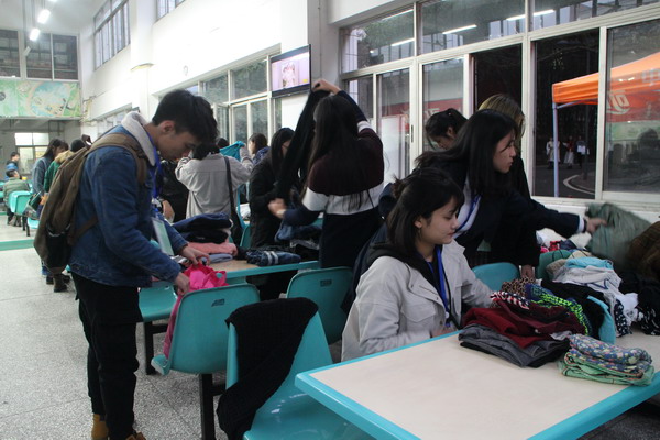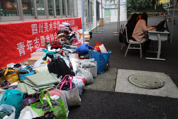 16日上午10点,青年志愿者们在黄桷坪校区食堂门口开始了募捐活动的场地布置、活动宣传、捐赠登记工作。期间有不少爱心人士前来捐赠衣物用品,志愿者们将他们的名字和信息一一登记,并代表贫困山区的人们向捐赠者表示感谢。