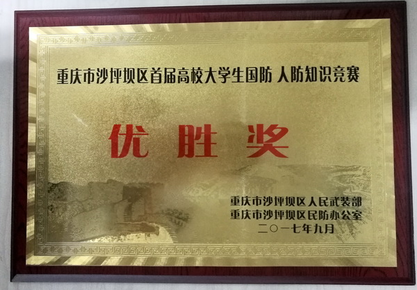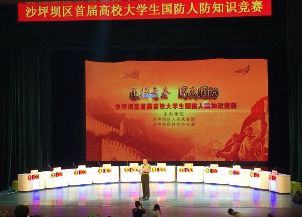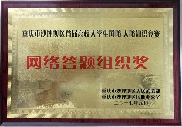 为增强学校广大学生的爱国情怀,强化大学生国防知识,加强与沙坪坝区各高校之间的国防教育工作交流,学校武装部、团委联合组织学生参加了由沙坪坝区人民武装部、沙坪坝区民防办公室主办的沙坪坝区首届高校大学生国防人防知识竞赛,竞赛分为网络答题和现场竞赛环节,学校在两个比赛环节均取得奖项。参加此次竞赛的高校有四川美术学院、重庆大学等11所高校。
