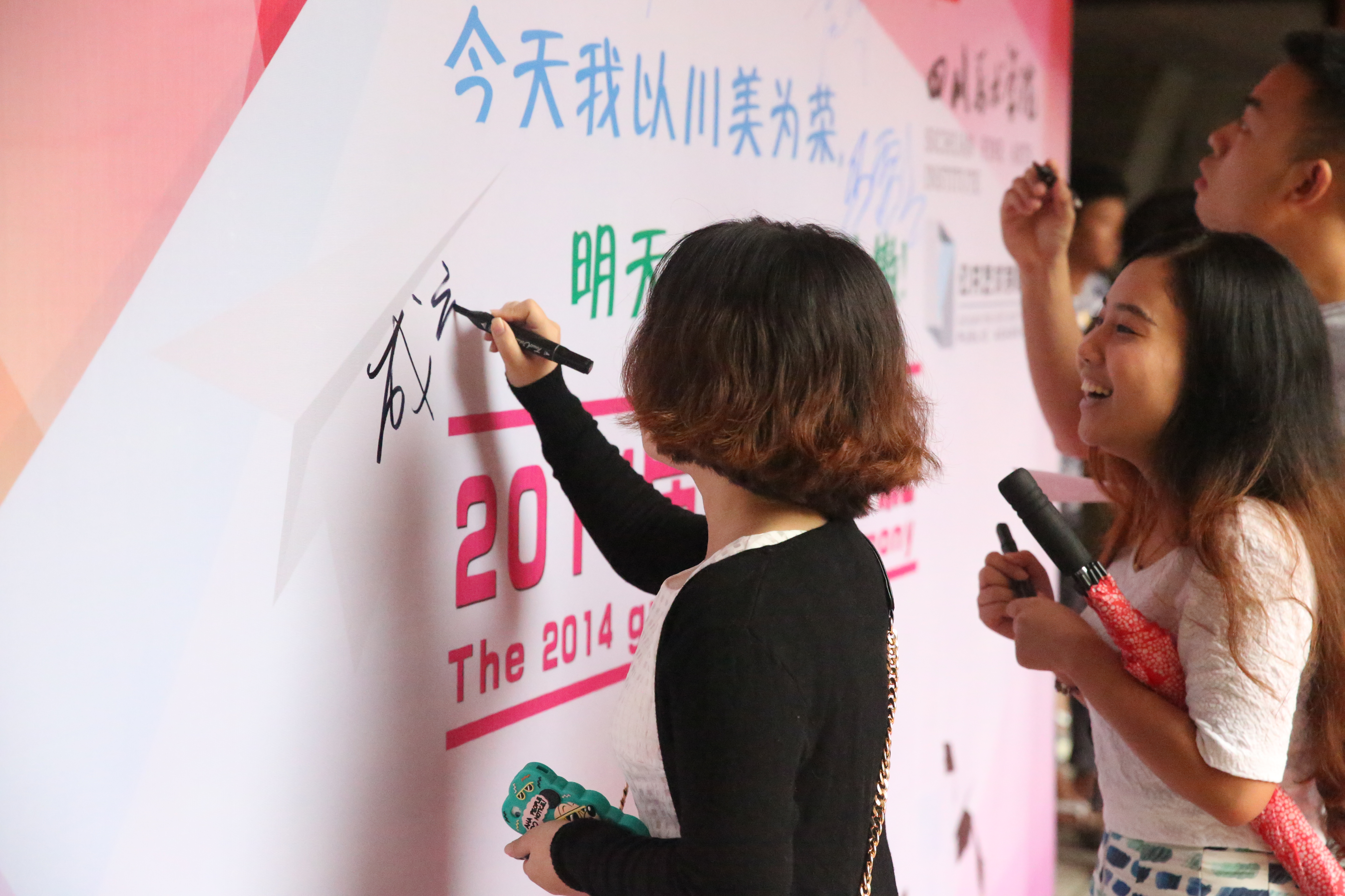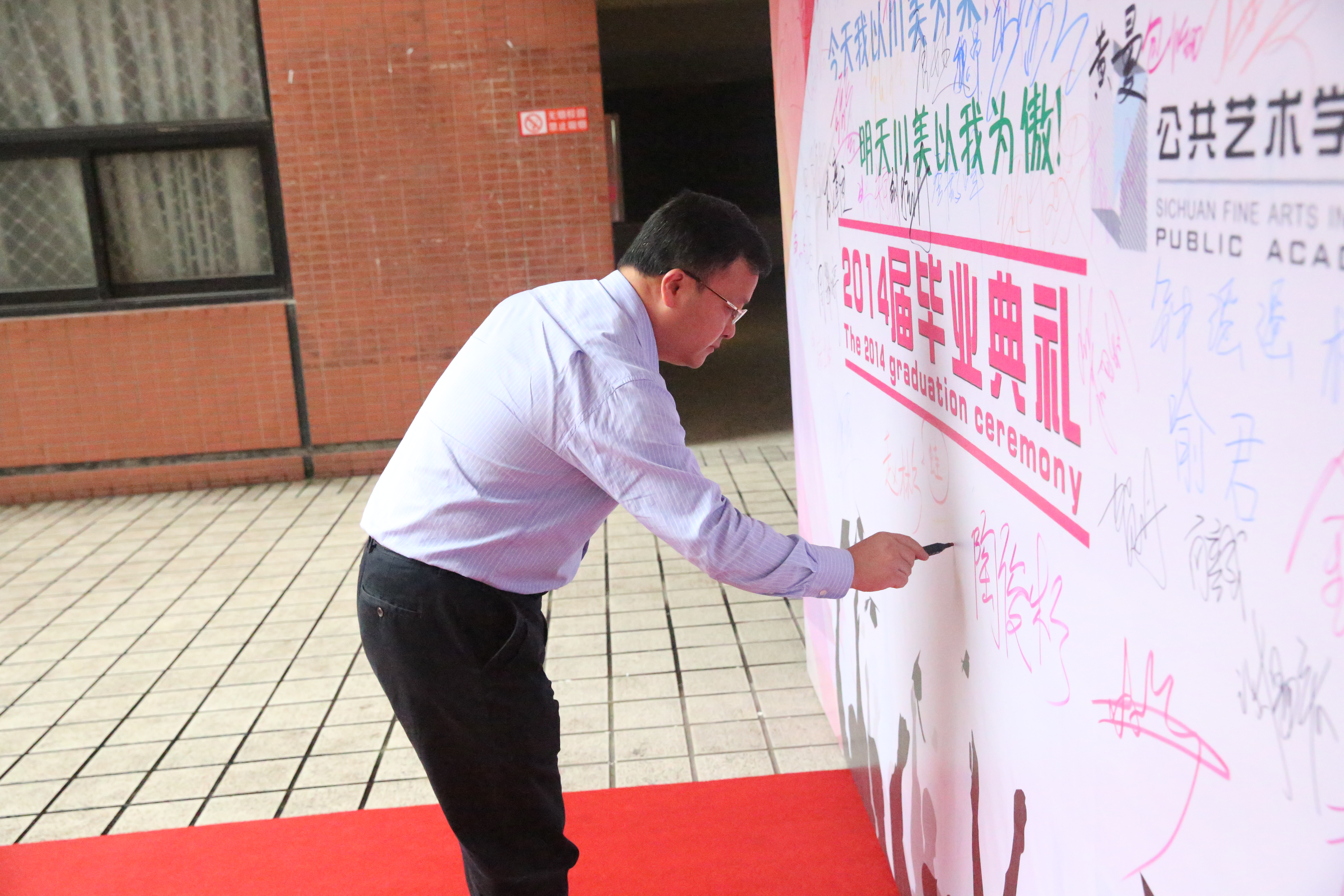 典礼开始前,在综合楼广场进行了入场式,师生们一起走过红地毯,在“今天我以川美为荣,明天川美以我为傲”的背景喷绘上写下自己的名字,作为留给母校的纪念。紧接着毕业生们自弹自唱,在歌声中一起追忆着自己的青春岁月、校园往事。
