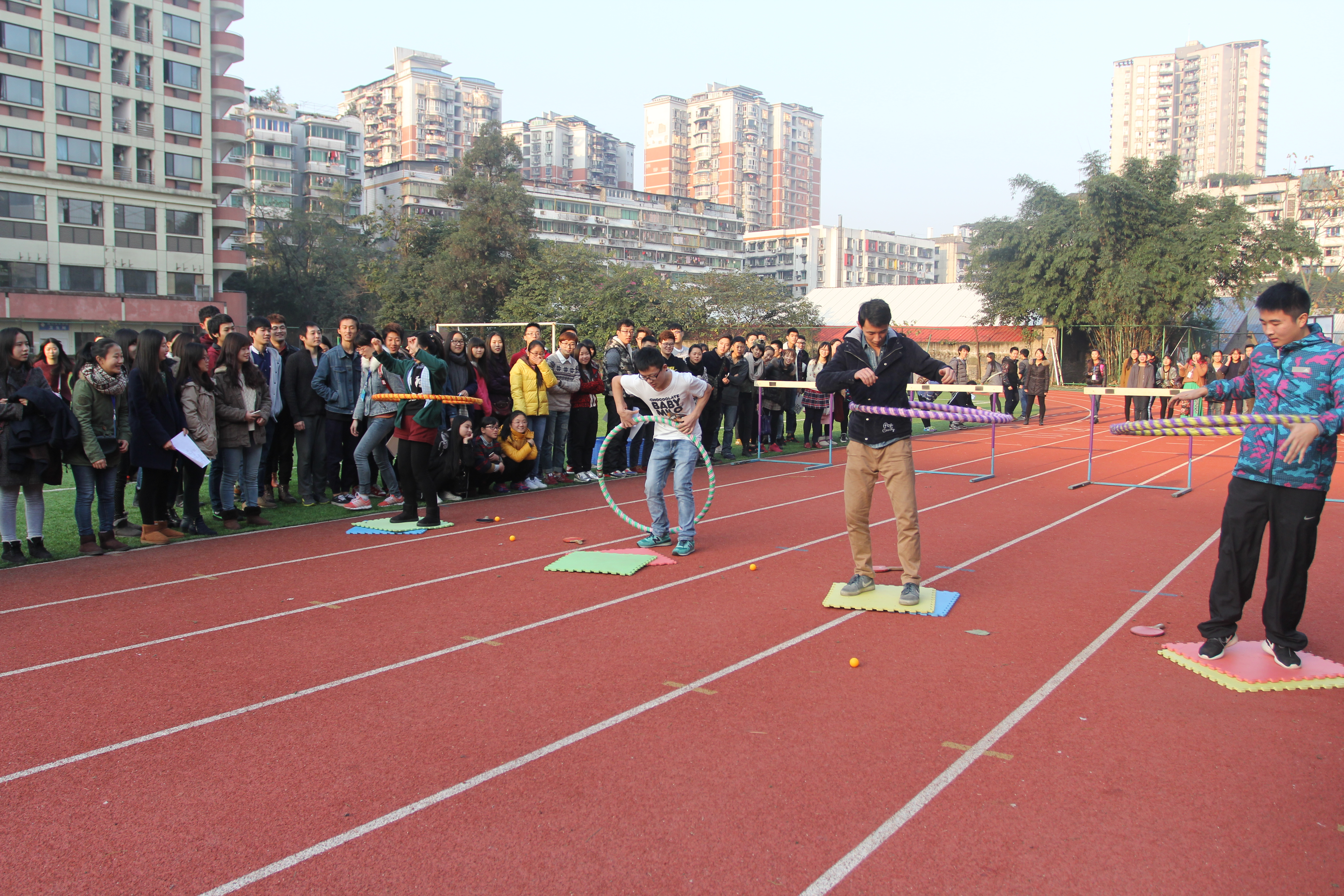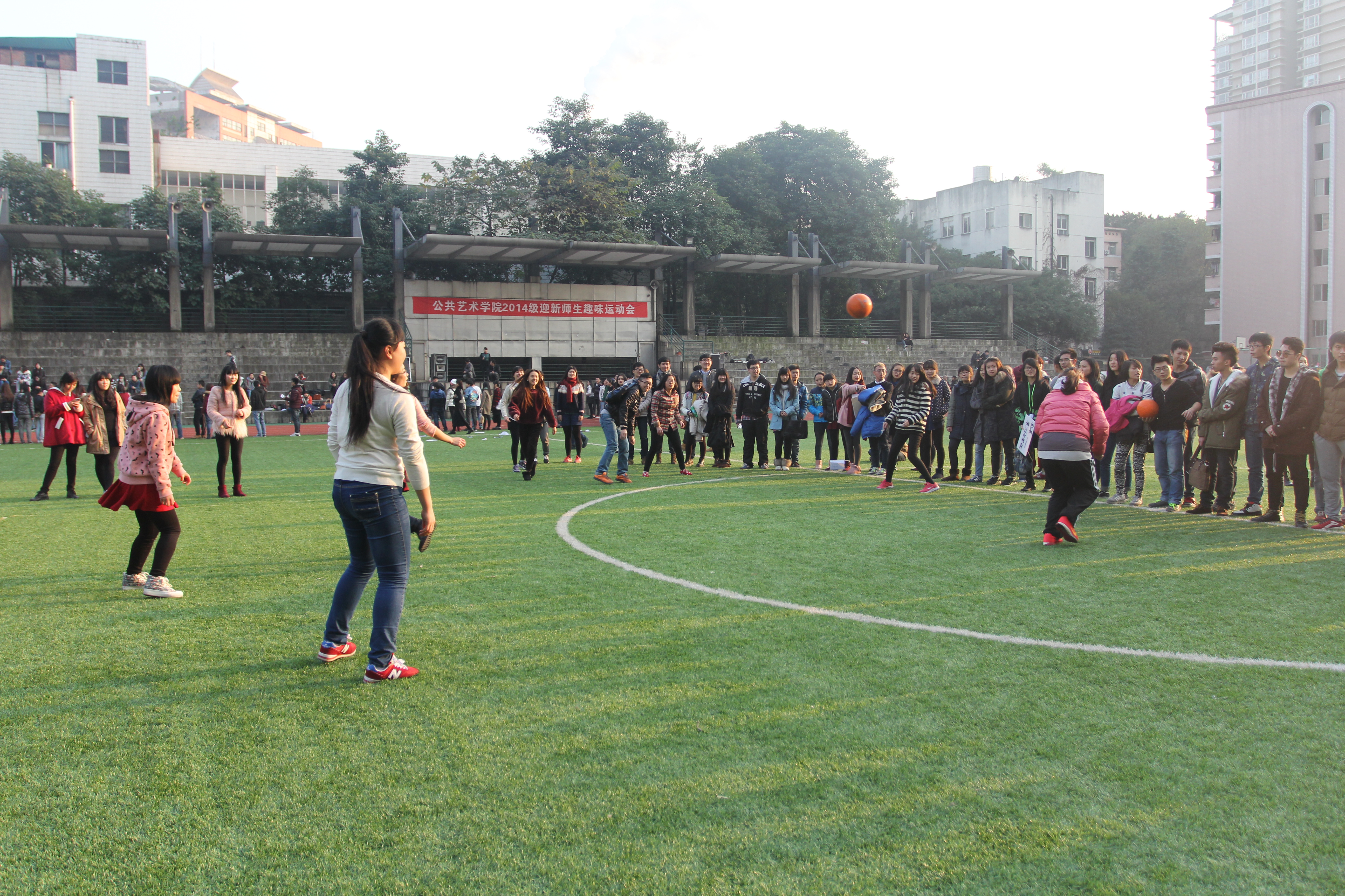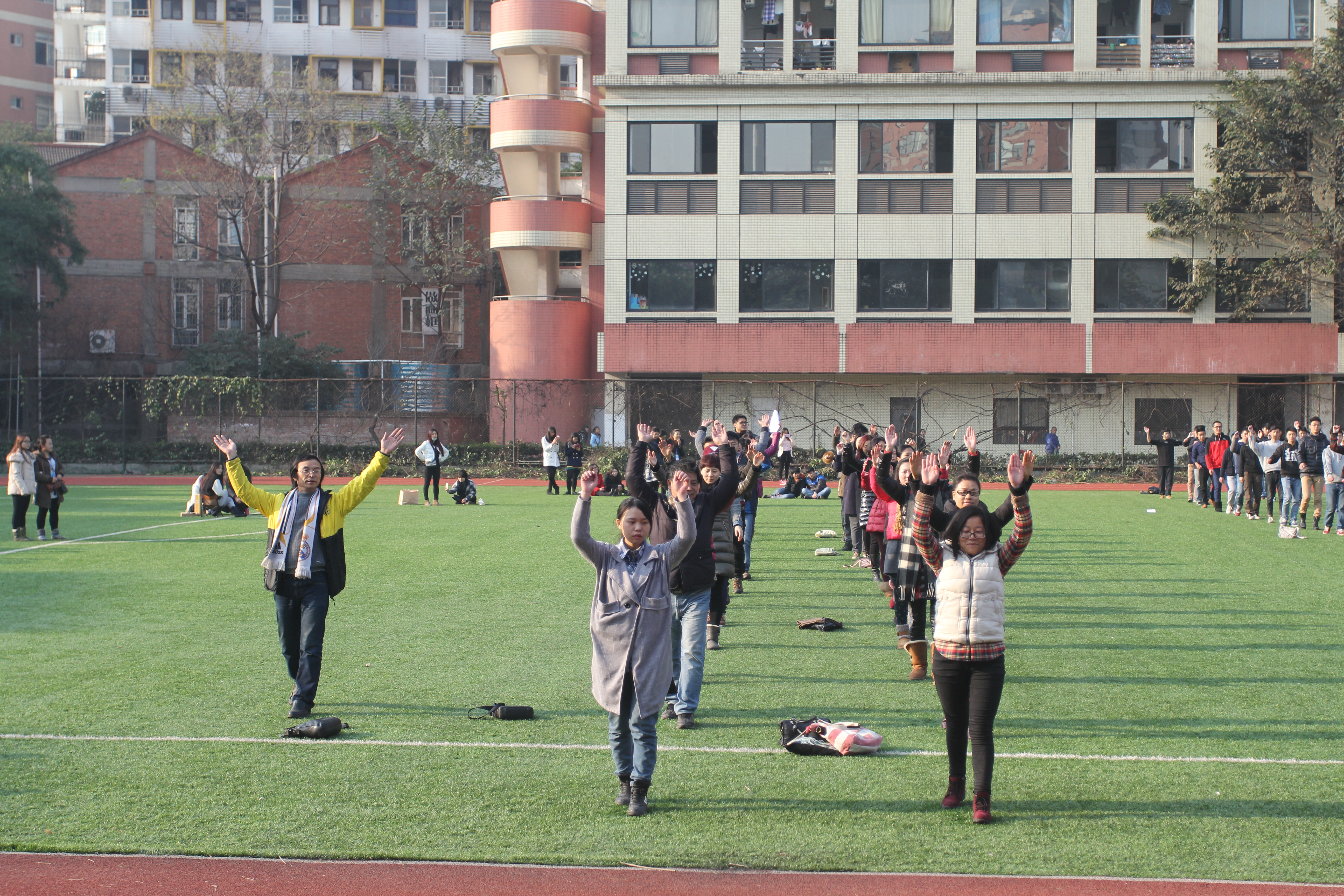 银杏飘黄,冬阳送暖。12月19日下午3:30,公共艺术学院师生伴着久违的暖阳,在黄桷坪校区田径场开展了迎新年趣味运动会。学院党政领导沈渝德、谢鸣理、秦谊、黄山带领教职工参加,与500名2014级新生一起健身互动。