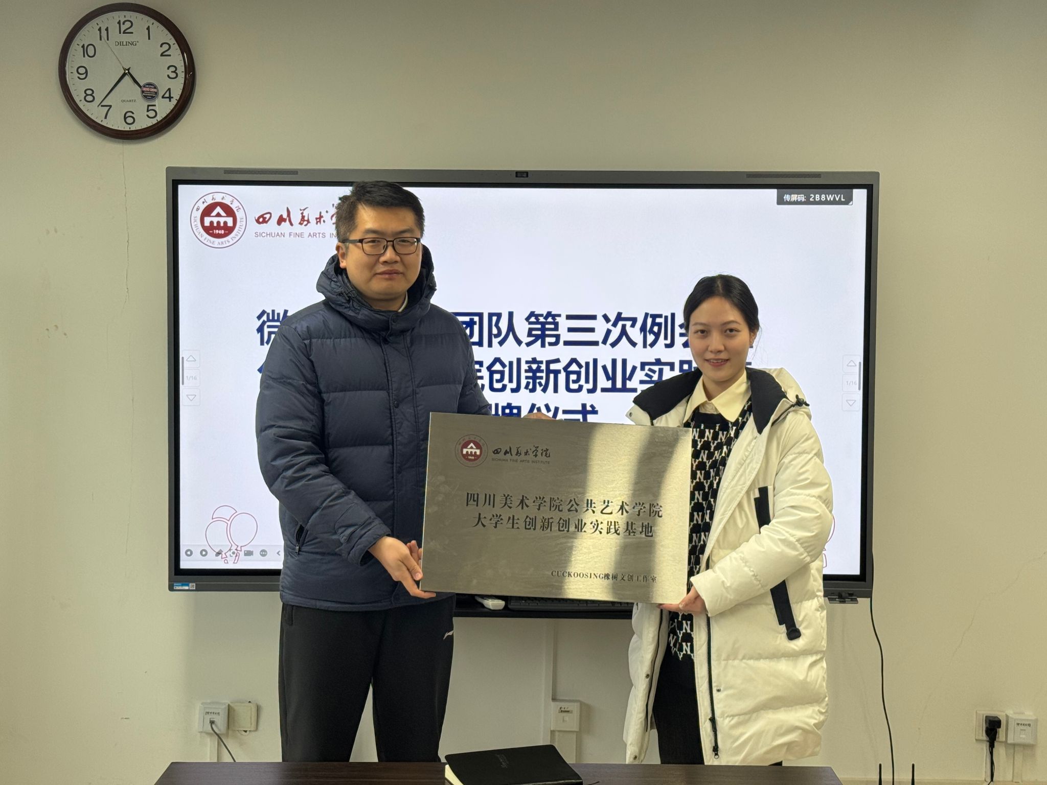 1月23日,公共艺术学院创新创业实践基地授牌仪式顺利举办。本次授牌仪式由学院辅导员尹力主持,学院党委副书记、纪委书记张坤出席并为授牌单位颁奖。授牌仪式现场,张坤为“画语重构”工作室授予“公共艺术学院创新创业实践基地”牌匾,该工作室是学院大学生创新创业优秀成果的代表团队。此次授牌是对优秀学生创新创业成果的表彰与肯定,更是学院以榜样力量激发全院学子创业热情的重要举措,为学院深化创新创业教育、搭建实践育人平台奠定了坚实基础。