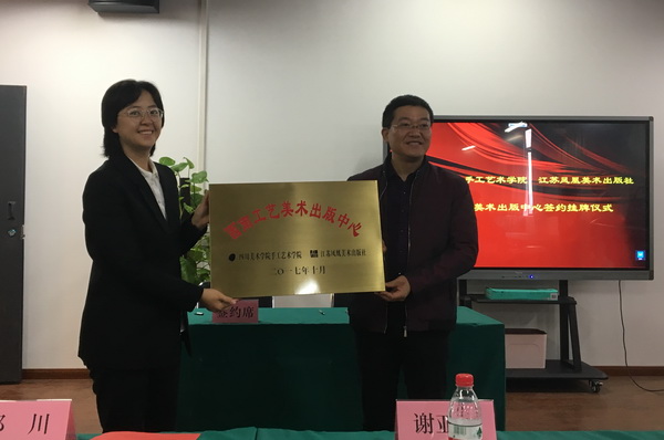 10月20日上午,为响应党的十九大“不忘初心,砥砺前行”的号召,手工艺术学院和江苏凤凰美术出版社战略合作签约暨“西南工艺美术出版中心”的授牌仪式在四川美术学院手工艺术学院举行。仪式由手工艺术学院党总支书记郑川主持。手工艺术学院副院长谢亚平、江苏凤凰美术出版社社长葛庆文、江苏凤凰美术出版社副总编方立松、江苏凤凰美术出版社设计出版中心副主任王左佐,以及手工艺术学院各系主任、骨干教师参加了仪式。
