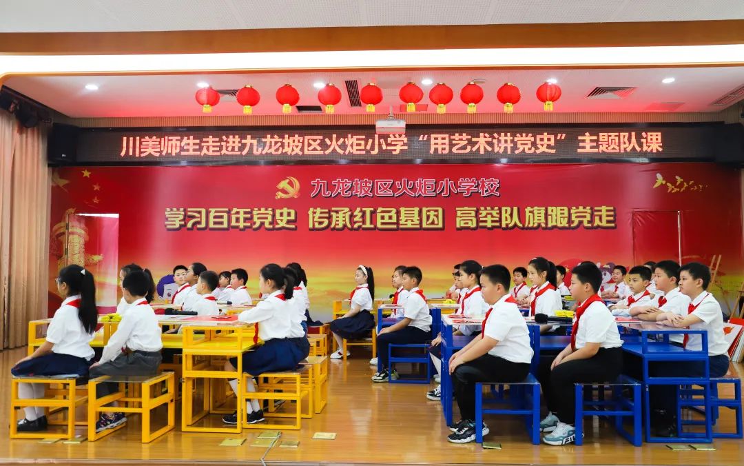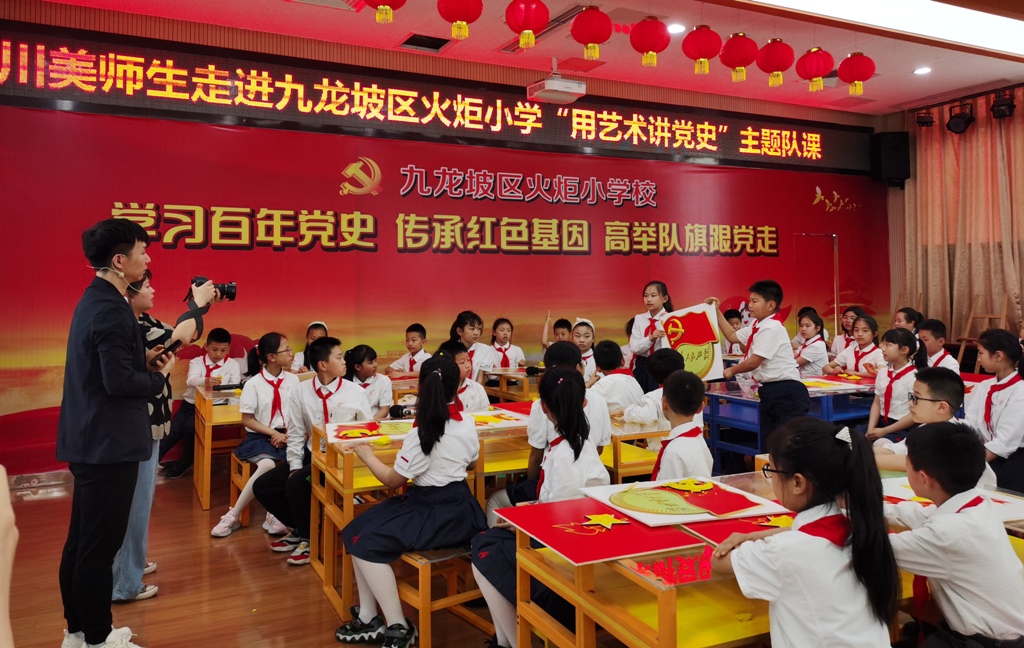 公共艺术学院党总支围绕学校党史学习教育总体部署,贯彻落实学校开展“用艺术讲党史”主题活动的相关要求,公共艺术学院党总支于5月14日联合九龙坡团区委,深入辖区火炬小学, 开展了一场生动活泼又富有教育意义的党史学习教育专题课。