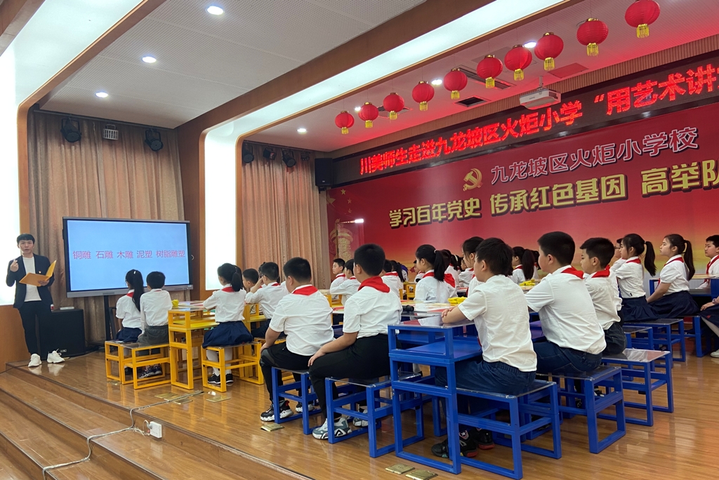 青年教师党员谢勋同志以《收租院》《歌乐山烈士群雕》、《冬去春来》等不同时期的雕塑作品为案例,向火炬小学的同学们详细讲解了艺术家在主题内容、人物塑造、创作手法、艺术语言等方面的演变,以及蕴含在其中的党史故事,将党领导人民开展新民主主义革命到社会主义建设的探索和发展成就,用艺术的视角予以展现。