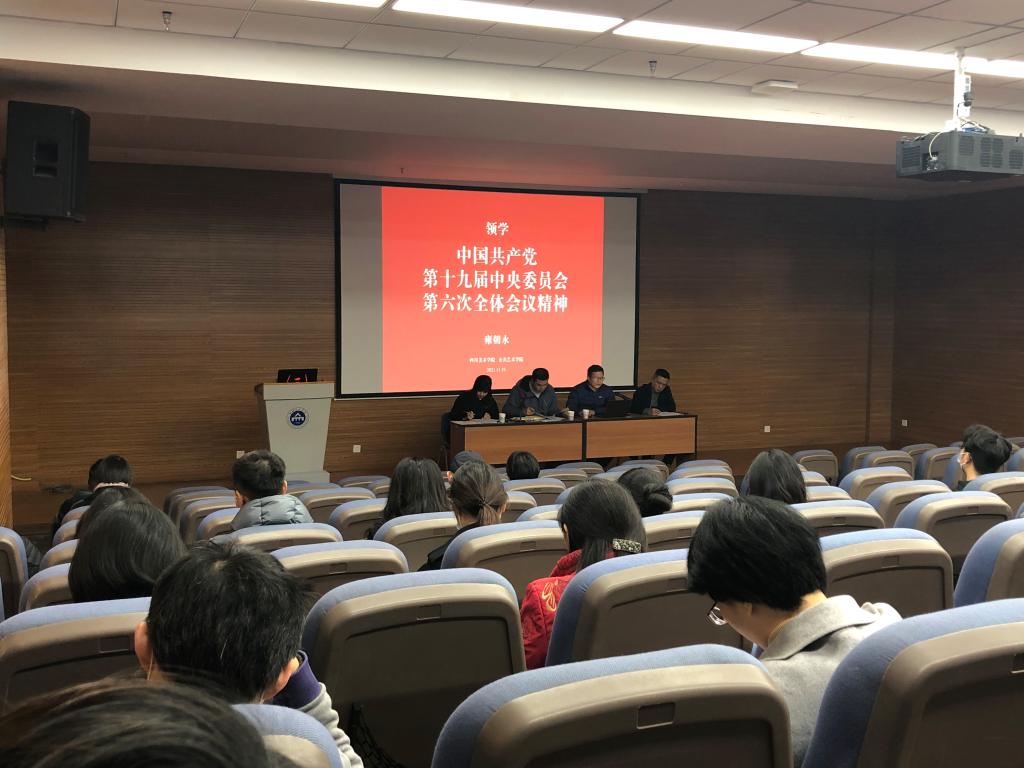 学院党总支书记雍朝永首先领学了中国共产党第十九届中央委员会第六次全体会议精神。他从“总结党的百年奋斗重大成就和历史经验的重大意义”“党的百年历程的四个伟大飞跃”“两个确定对新时代党和国家事业发展以及民族复兴大业的决定性意义”等七个方面,对全会精神进行了全面阐释和解读。重点领学了“四次伟大飞跃”“十三个方面概括的新时代发展成就”“党的百年奋斗十大宝贵历史经验”等内容,并分享了自己的学习感悟和收获。他强调,我们要紧跟党的号召,增强“四个意识”、坚定“四个自信”、做到“两个维护”,坚定不移地做到“十个坚持”,自觉践行初心使命,在新时代更好地坚持和发展中国特色社会主义,为实现第二个百年奋斗目标、实现中华民族伟大复兴的中国梦而不懈奋斗。