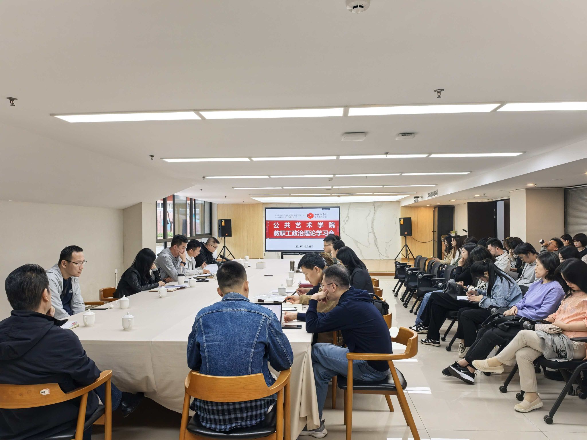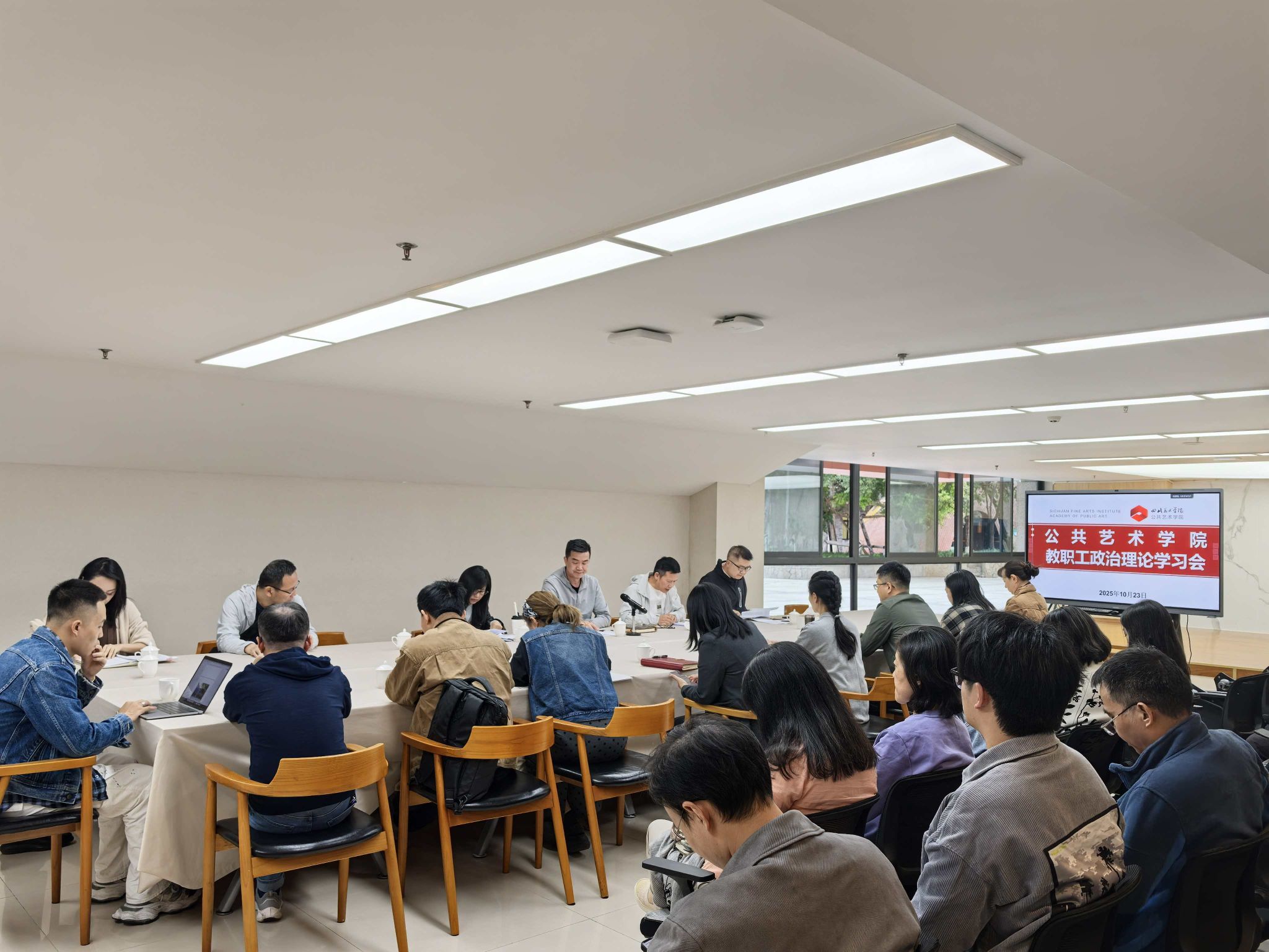 为进一步加强教职工政治思想建设,全面提升教职工政治素养与业务能力,10月23日下午,公共艺术学院在黄桷坪校区四会议室召开教职工政治理论学习会。学院党委副书记纪委书记张坤主持会议,全体教职工参会。