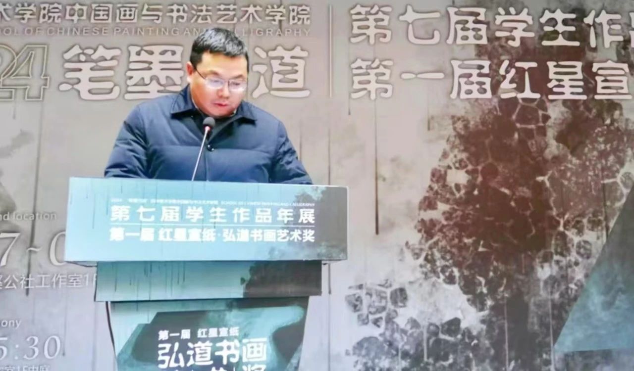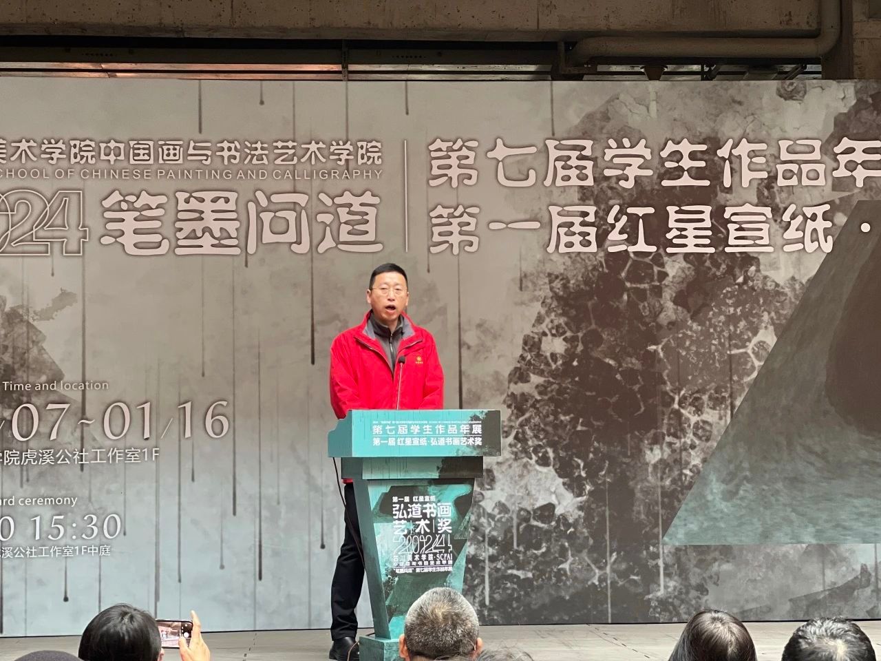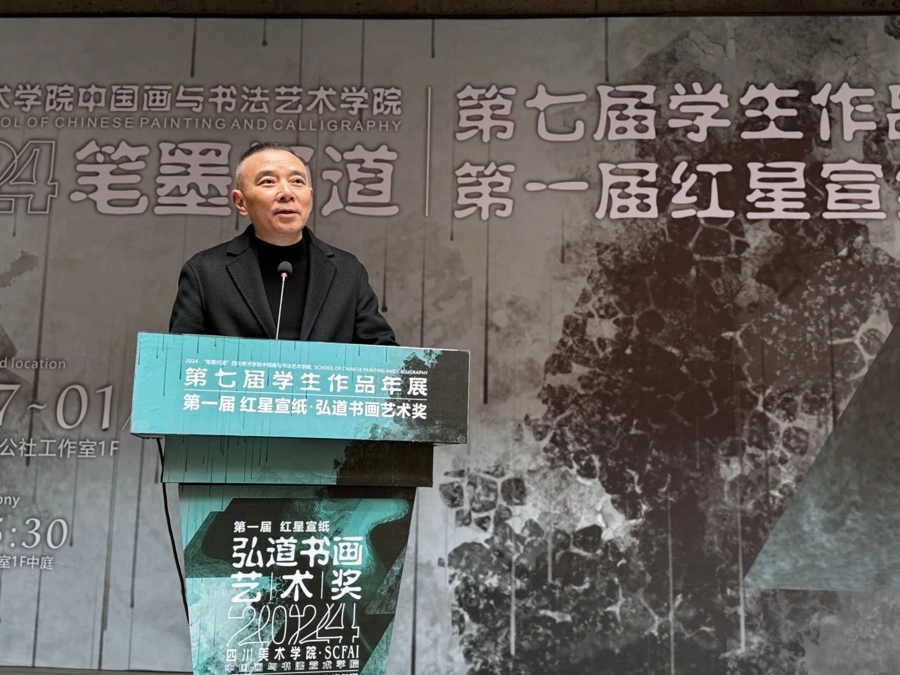 中国宣纸股份有限公司党委书记、董事长赵胡鲲为颁奖仪式致辞。他表示宣纸作为传统中国画创作的关键材料,其独特的质地与肌理能完美呈现笔墨韵味,是书画艺术不可或缺的灵魂元素。川美师生与我们共同肩负着传承与发展书画艺术的使命,助力川美书画教育,红星宣纸不应缺席,助力传播宣纸文化,川美师生大有可为。