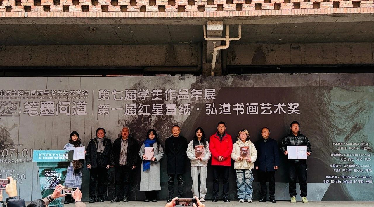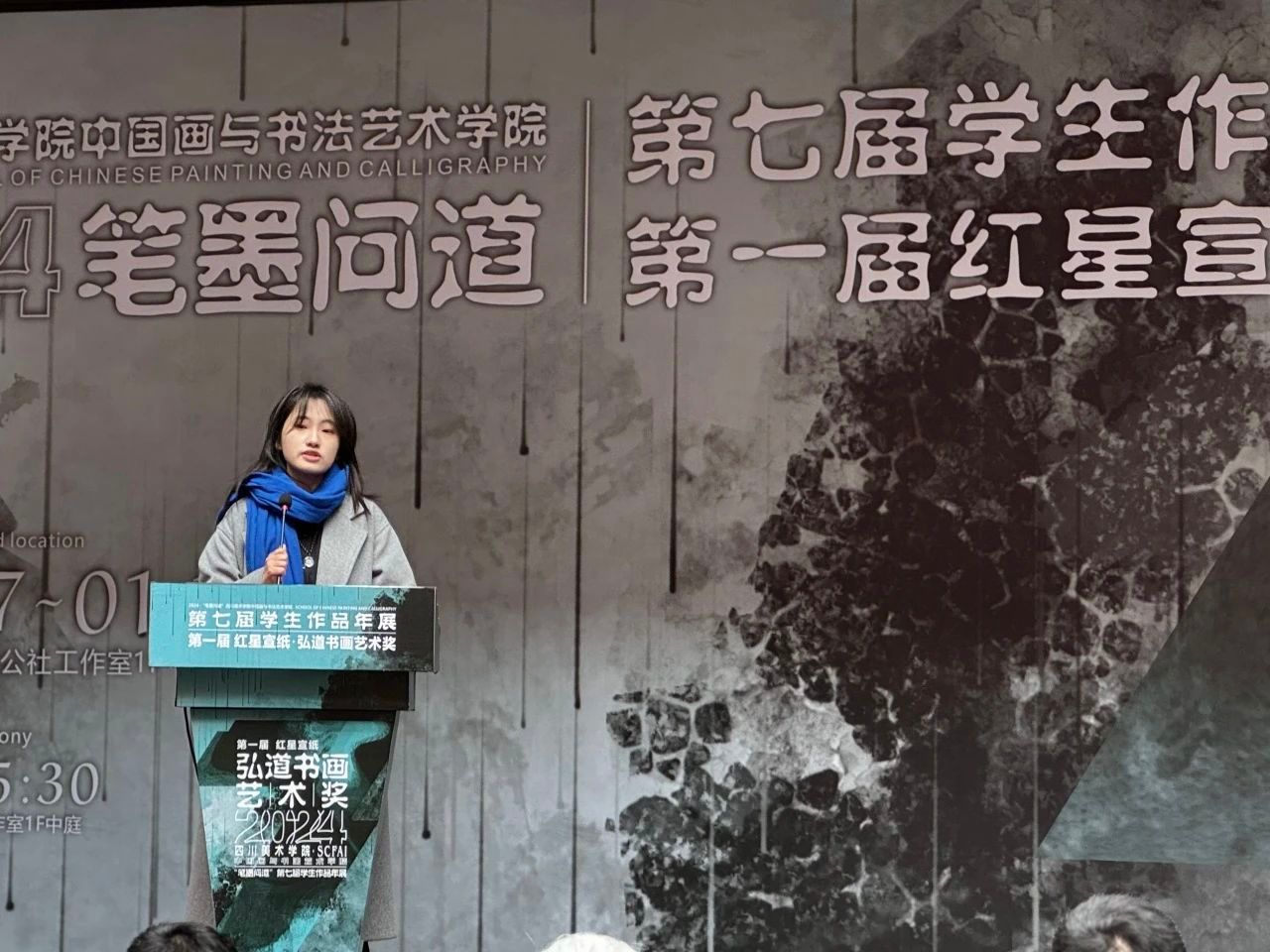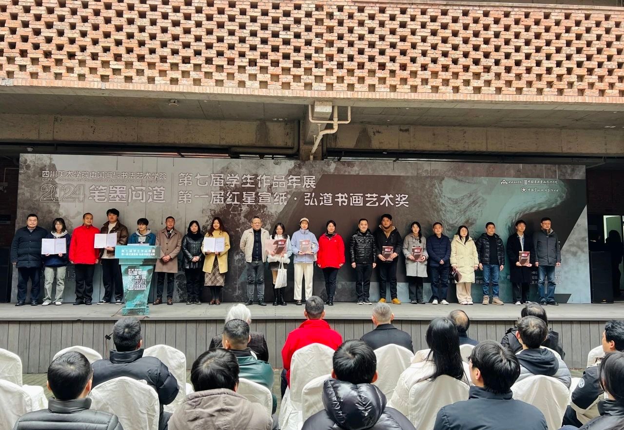 1月10日,由四川美术学院、 中国宣纸股份有限公司主办的笔墨问道-四川美术学院中国画与书法艺术学院第七届学生作品年展曁第一届“红星宣纸·弘道书画艺术奖”举行颁奖仪式。颁奖仪式由四川美术学院中国画与书法艺术学院副院长肖志主持。