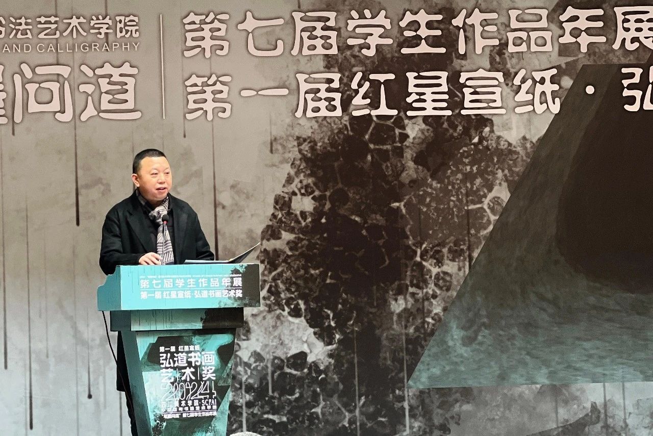 四川美术学院院长焦兴涛在致辞中指出,四川美术学院中国画与书法教学,历史底蕴深厚,育人成果丰硕。笔墨问道-四川美术学院中国画与书法艺术学院学生作品年展距今已成功举办六届,第七届年展不仅在作品的规模和类别上实现了新突破,更在作品的艺术性和思想性上取得显著进步,展现了同学们在中国传统文化创造性转化、创新性发展道路上的不懈努力和创新精神。此次设立“红星宣纸·弘道书画艺术奖”,旨在深化校企合作,共同为社会主义文艺发展繁荣作出贡献。红星宣纸作为中国传统书画艺术的重要载体,与川美国书院一道,搭建起艺术创作与传统文化传承之间的桥梁。与红星宣纸集团的合作,是我校国书院在服务社会、推动中国书画艺术传承与发展方面的积极作为。