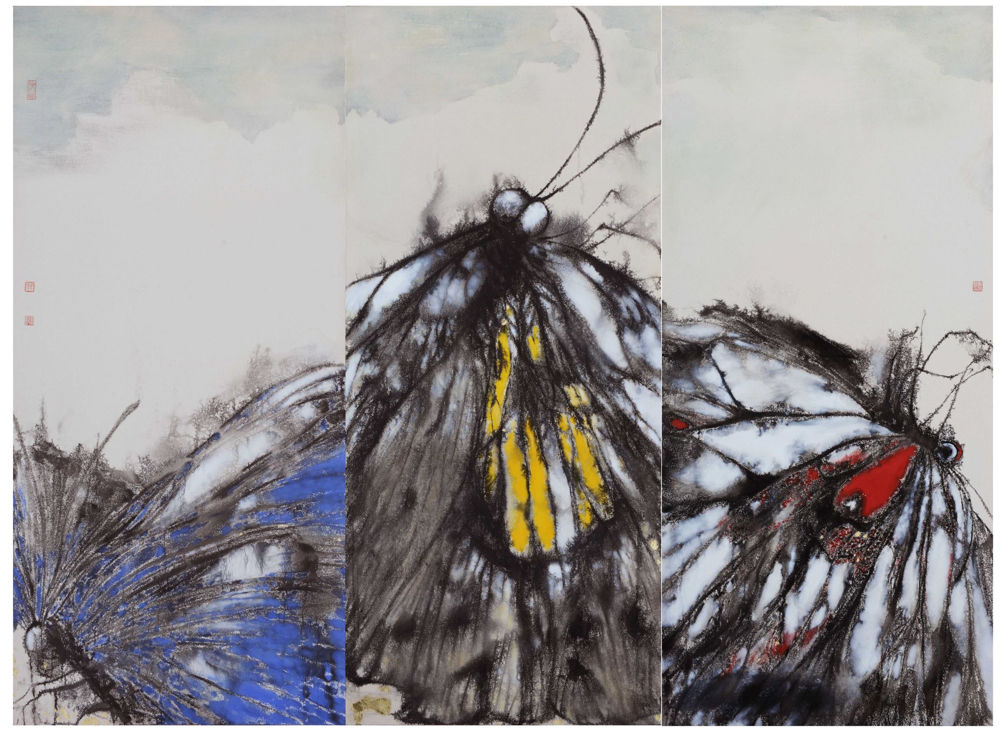 作品通过蝴蝶局部形象的微观体验来表达宏观世界的生命感动。中国古代哲学有庄周梦蝶的典故,“不知周之梦为蝴蝶与?蝴蝶之梦为周与?”作者借助这一典故表达对人生的思考;“我是谁?从哪里来?到哪里去?”。画面寓抽象于具象之中、寓宏观于微观之中、寓表现于再现之中。作品用布面、水墨、中国画颜料、金箔等多种材料材质美与书写性的艺术表达融为一体。在书写性的表达之中构建一种象征性的图式,并寻求布面材料的特殊体验。