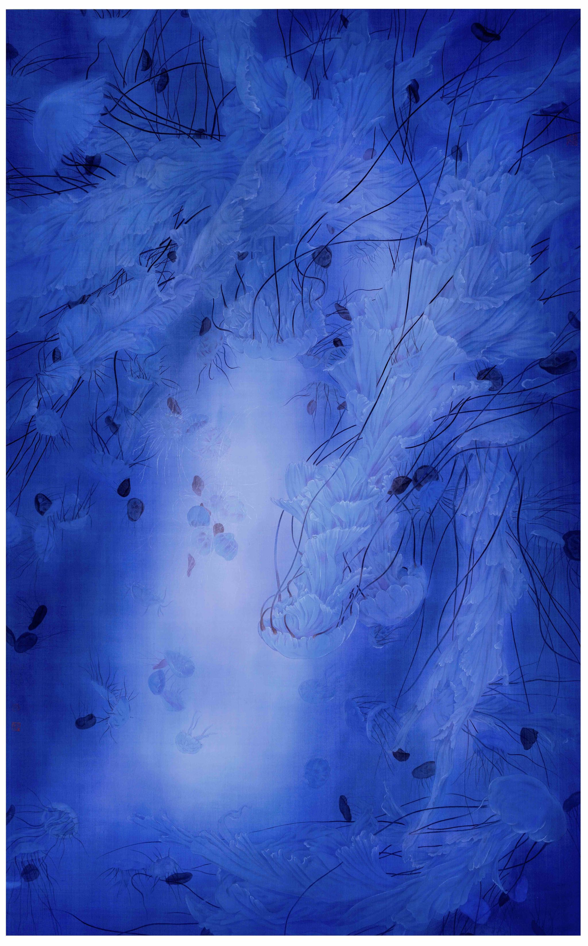 “中国画论---六法论”中的首要就是“气韵生动”,“气韵,生动是也”。是指作品中刻画的形象与艺术形式呈现出一种活泼泼的生命气象。气韵生动也是花鸟画的重要审美目标。我的作品《爱之光》力图通过水母形象及独特的画面意境来体现画面的“气韵生动”。