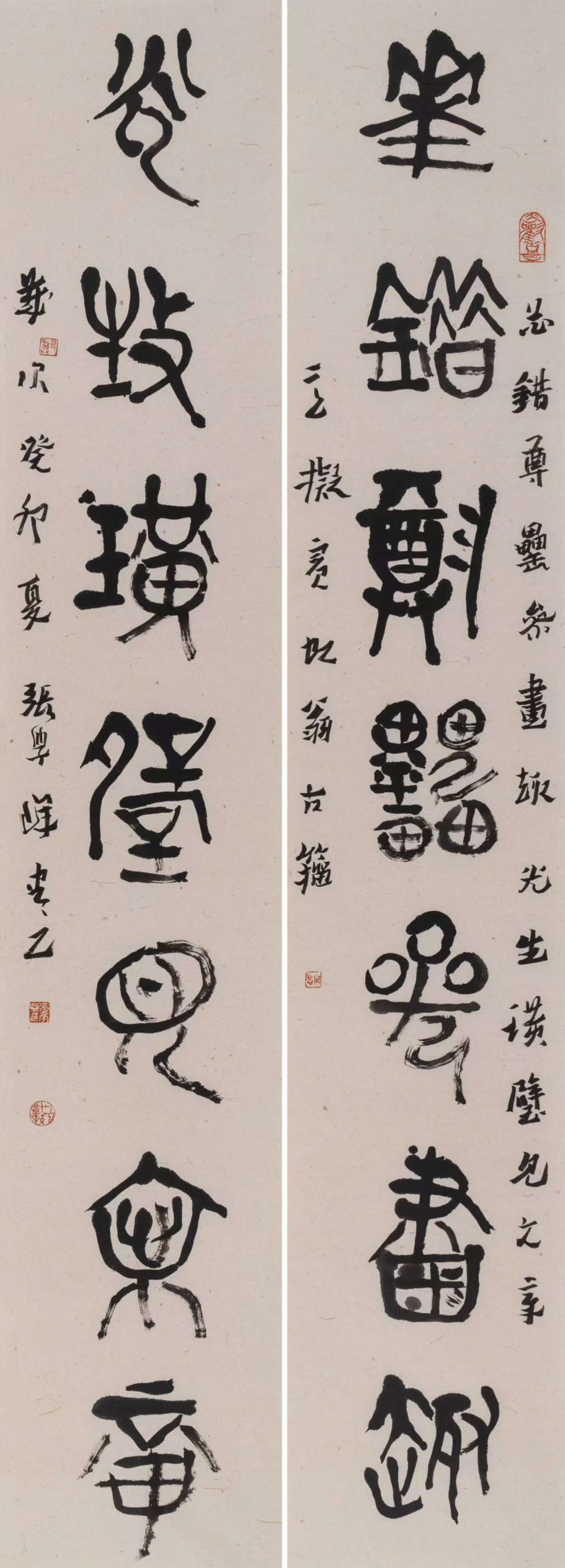 “花错光生”篆书对联。纸本,尺寸180—30cm,2023年创作。