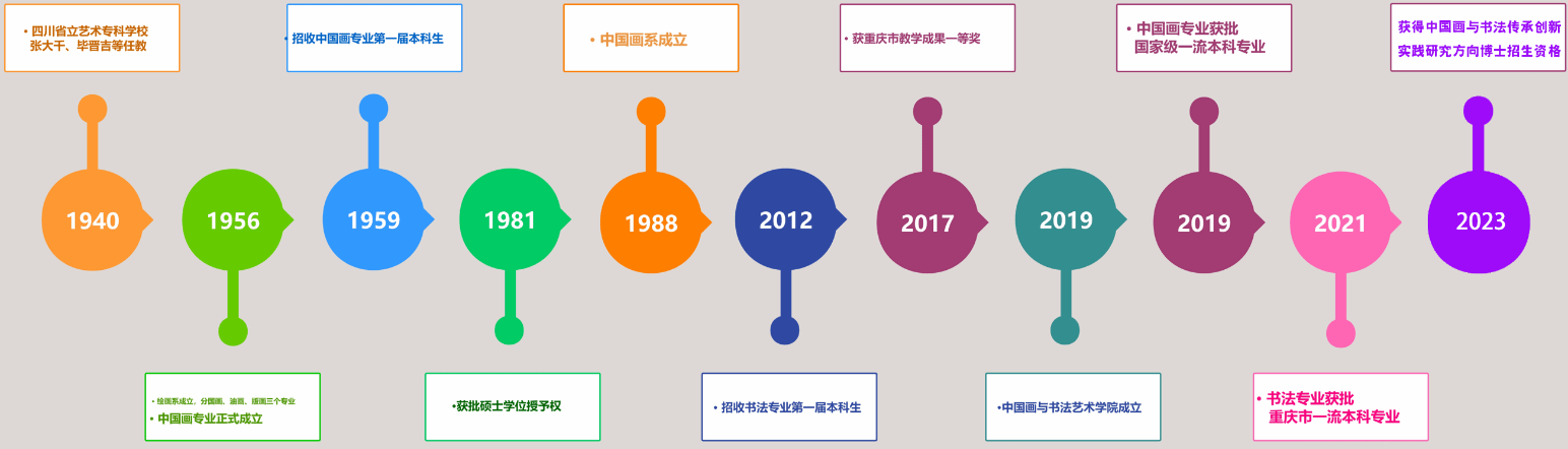 四川美术学院中国画与书法艺术学院历史悠久、声誉远播。学统最早可追溯至张大千任教于四川省立艺术专科学校时期,学术积淀厚重,在全国中国画与书法教育教学和科研创作领域具有重要影响。曾有冯建吴、李文信、黄原、白德松、唐允明等诸多著名艺术家执教,诞生了《峨眉天下秀》(冯建吴 联合国中国厅)、《长征》(李文信 人民大会堂四川厅)、《红岭》(唐允明 第八届全国美展最高奖“日中友好会馆大奖”)、《新绿》(李文信 第九届全国美展大奖“关山月美术基金奖”及终身成就奖)等一大批“思想精深、艺术精湛、制作精良”的艺术精品,涌现出尼玛泽仁、法比恩、郝量等一大批杰出校友,为社会输送了大批中国画教学、科研、创作专门人才。