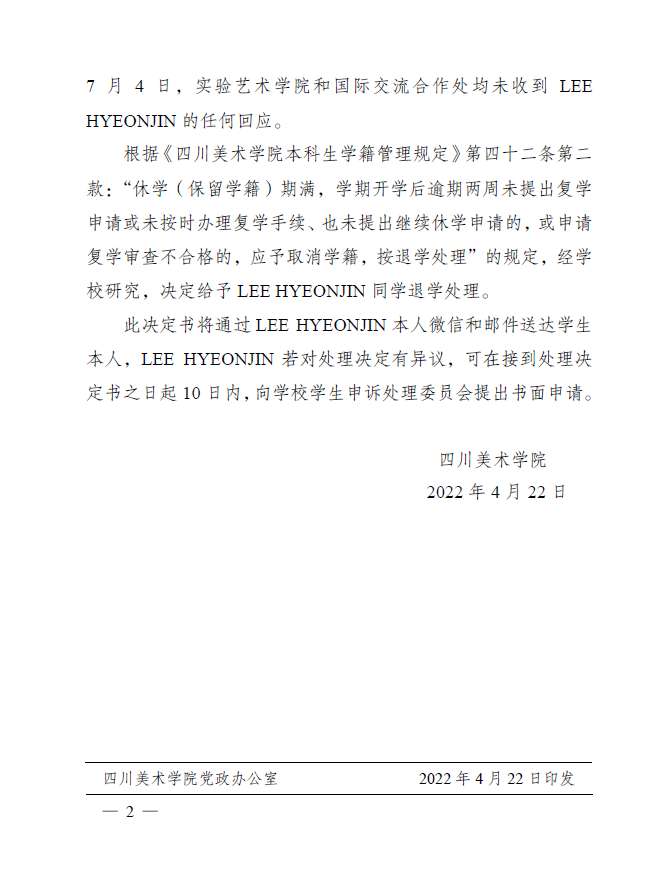 四川美术学院关于给予韩国籍学生LEE HYEONJIN同学退学处理的决定.pdf
