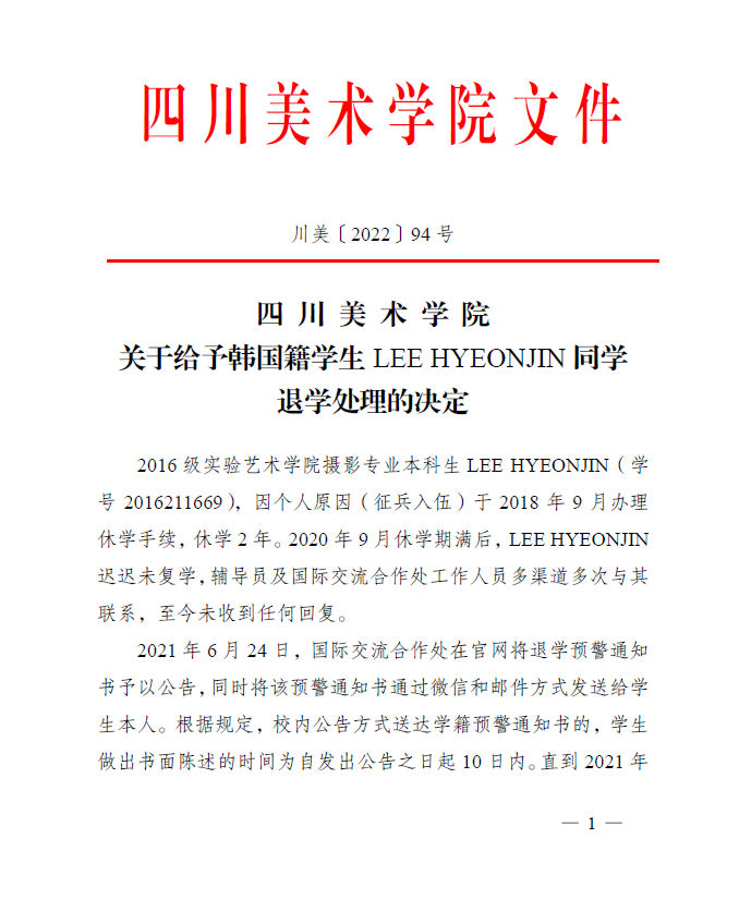 四川美术学院关于给予韩国籍学生LEE HYEONJIN同学退学处理的决定