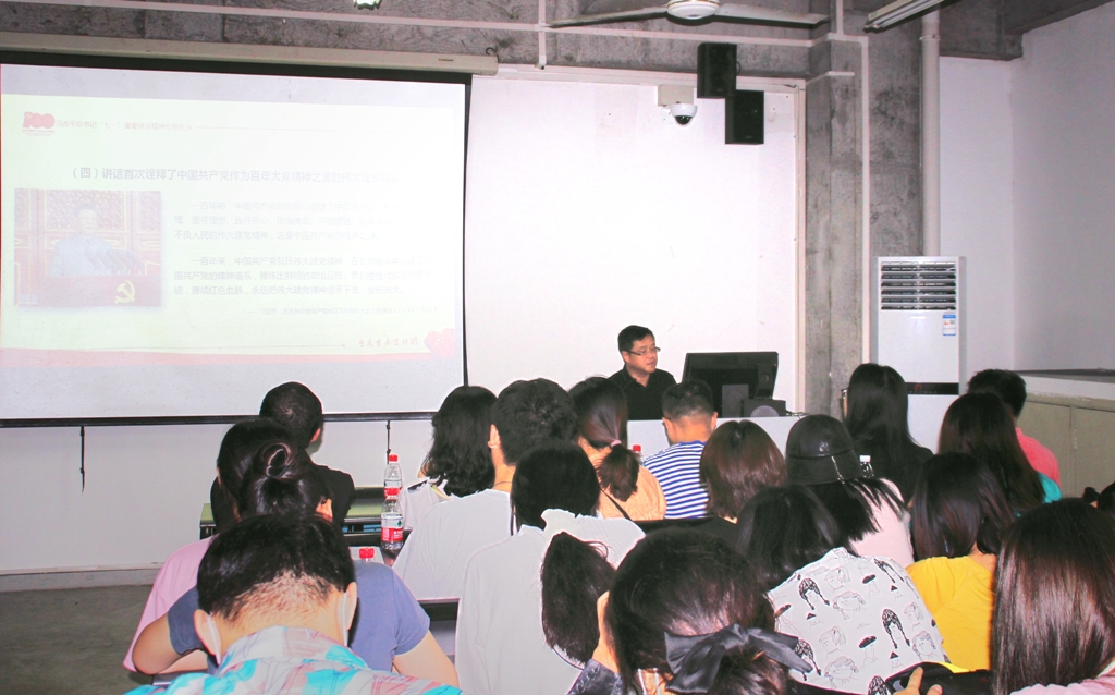 近日,学校党史学习教育宣讲队成员、校长庞茂琨以《学习贯彻习近平总书记“七一”重要讲话精神》为题,为艺术人文学院全体师生党员作专题宣讲。宣讲会由艺术人文学院党总支书记陈德洪主持。学院全体师生党员、入党积极分子等近50人参会。