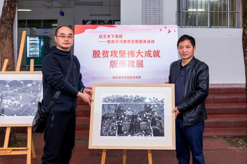 两支部参观了宣传部党支部组织的“送艺术下基层”志愿服务和为民办实事活动——脱贫攻坚伟大成就主题版画微展,用艺术的方式展现党领导人民取得的脱贫攻坚巨大成就和深刻变化,微展览深受大佛初级中学的师生欢迎。宣传部党支部书记余晖向大佛初级中学党总支赠送了我校造型艺术学院版画系师生创作的《习近平新时代中国特色社会主义思想绘本》和脱贫攻坚主题版画作品。