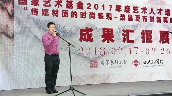 9月17日下午3点30分,由中华人民共和国文化部批准,四川美术学院主办,四川美术学院设计艺术学院承办,重庆壹秋堂文化传播有限公司协办的国家艺术基金项目《传统材质的时尚表现—荣昌夏布创新再造人才培养》成果汇报展开幕式在四川美术学院虎溪公社举行。校长庞茂琨、项目负责人研究生处处长苏永刚、创作科研处处长潘召南、设计艺术学院党总支书记韦芳、手工艺术学院副院长谢亚平、势焰文化总经理国际当代艺术中心馆长黄诗俨等专家领导、项目授课教师代表和学员代表等出席展览开幕仪式。仪式由设计艺术学院服装设计系副主任程琦主持。