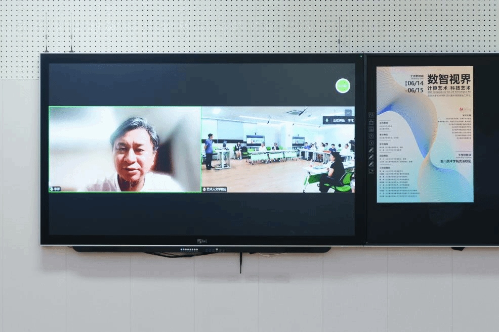 北京大学艺术学院李洋院长作线上发言。他首先表达了对本次工作坊活动的肯定和对川美师生的感谢,并分享了北大艺术学院设立计算艺术与设计班的目的,希望借助人工智能发展探索艺术人才培养的新道路。最后,李洋院长还强调了北大与川美合作的重要性,认为北大学生所长在人文传统和理论优势,需要更多深入创作和实践的土壤,并期待未来与川美展开更多的交流与合作。