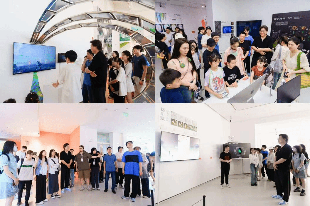 14日下午,在四川美术学院艺术人文学院院长王天祥,四川美术学院艺术人文学院教授郭硕博的带领和陪同下,本次工作坊成员先后参观了四川美术学院美术馆的展览:“学脉华章——铸牢中华民族共同体意识的川美实践”、“收租院群雕铸铜作品及文献展”和“开放的六月”2025年本科生毕业展。本次观展聚焦于“计算艺术|科技艺术”的工作坊主题,在设计学院李渝老师、影视与动画学院数字艺术实验班郭亦婷和闵良奇同学、实验艺术学院科技艺术专业王岑霖同学的导览和介绍下,重点观看了设计学院、影视动画学院与实验艺术学院的本科生毕业作品。