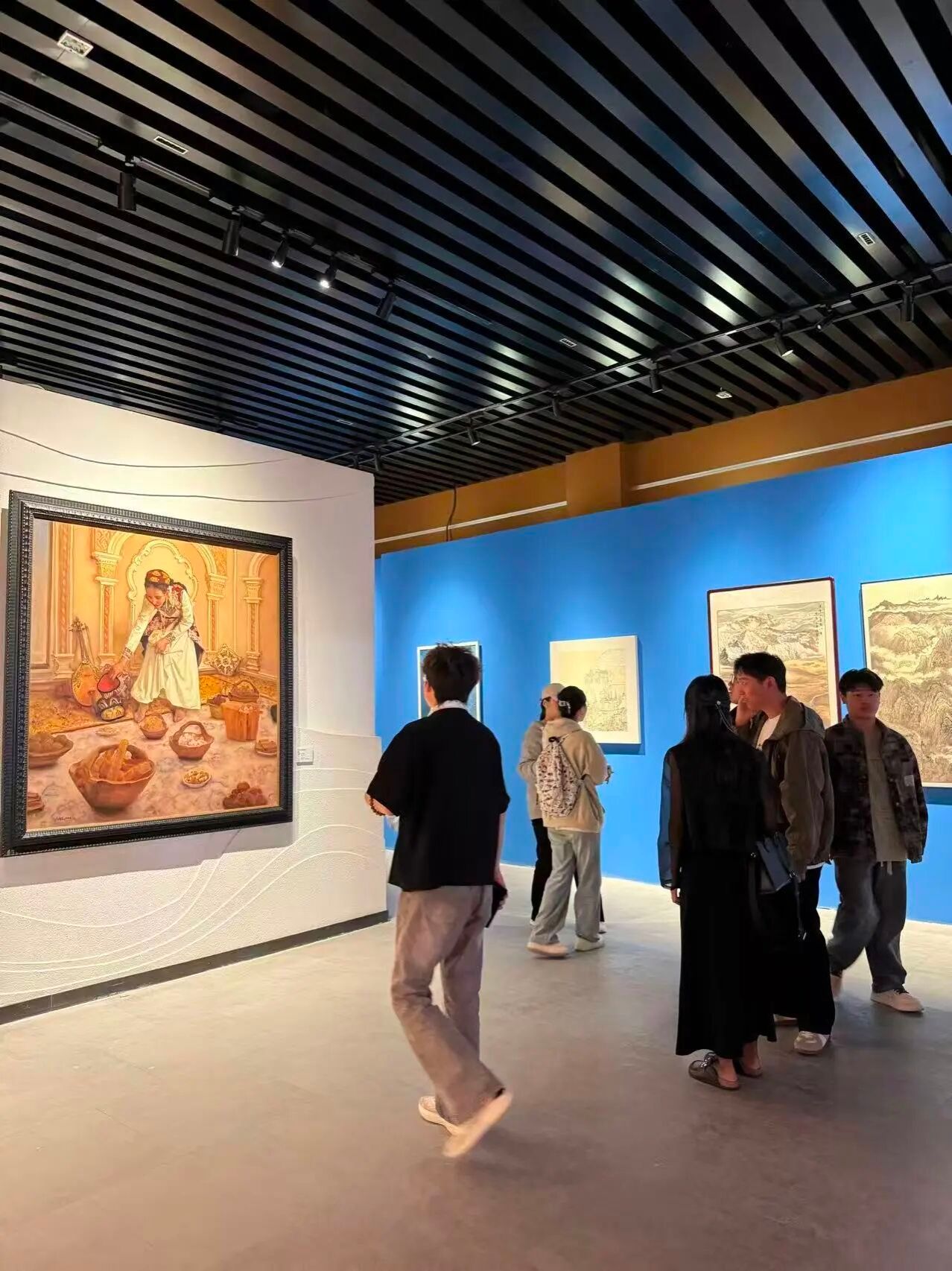 焦兴涛院长在致辞中指出:“四川美术学院作为中国西部地区重要的艺术学府,始终引导师生关注辽阔的西部大地,创作出一批彰显民族团结、展现时代风貌的优秀作品。”他强调,四川美术学院西部艺术与中华民族共同体研究院,作为推动新时代西部大开发和铸牢中华民族共同体意识的重要学术平台,正依托西部高校艺术学联盟,在新疆和田地区开展富有成效的实践,发挥着积极的引领作用。铸牢中华民族共同体意识,是维系国家统一和民族团结的强大精神纽带,也是艺术工作者肩负的重要时代使命。本次展览不仅是一次艺术的盛会,更是一次深刻的思想洗礼和情感共鸣。它让我们更加直观地感受到中华文化的博大精深与多元一体,体会到中华民族共同体强大的凝聚力和向心力。展览描绘了一幅各族人民手足相亲、守望相助、美美与共的生动画卷,深刻诠释了中华民族一家亲、同心共筑中国梦的时代主题。
